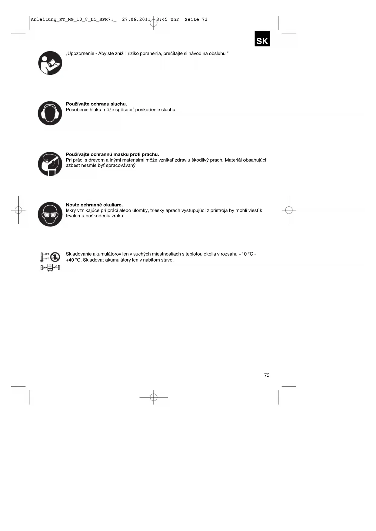 „Upozornenie - Aby ste znížili riziko poranenia, prečítajte si návod na obsluhu “ Používajte ochranu sluchu. Pôsobenie hluku môže spôsobiť poškodenie sluchu. Používajte ochrannú masku proti prachu. Pri práci s drevom a inými materiálmi môže vznikať zdraviu škodlivý prach. Materiál obsahujúci azbest nesmie byť spracovávaný! Noste ochranné okuliare. Iskry vznikajúce pri práci alebo úlomky, triesky aprach vystupujúci z prístroja by mohli viesť k trvalému poškodeniu zraku. Skladovanie akumulátorov len v suchých miestnostiach s teplotou okolia v rozsahu +10 °C - +40 °C. Skladovať akumulátory len v nabitom stave. Anleitung_RT_MG_10_8_Li_SPK7:_ 27.06.2011 8:45 Uhr Seite 73 Pozor! Pri používaní prístrojov sa musia dodržiavať príslušné bezpečnostné opatrenia, aby bolo možné zabrániť prípadným zraneniam a vecným škodám. Preto si starostlivo prečítajte tento návod na obsluhu/bezpečnostné pokyny. Následne ich starostlivo uschovajte, aby ste mali vždy k dispozícii potrebné informácie. V prípade, že budete prístroj požičiavať tretím osobám, prosím odovzdajte im spolu s prístrojom tento návod na obsluhu/bezpečnostné pokyny. Nepreberáme žiadne ručenie za nehody ani škody, ktoré vzniknú nedodržaním tohto návodu na obsluhu a bezpečnostných pokynov.