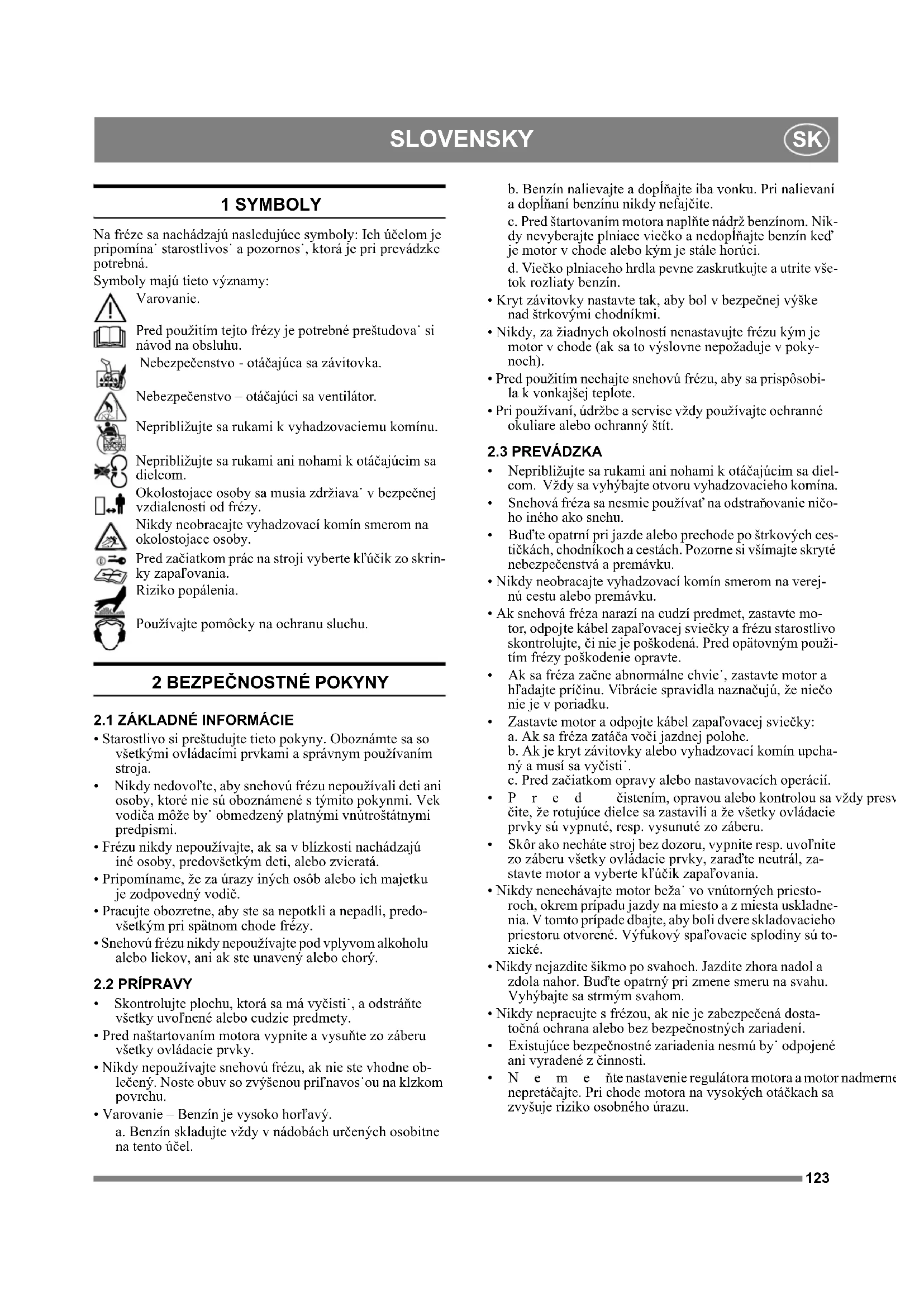 1 SYMBOLY Na fréze sa nachádzajú nasledujúce symboly: Ich účelom je pripomína˙ starostlivos˙ a pozornos˙, ktorá je pri prevádzke potrebná. Symboly majú tieto významy: Varovanie. Pred použitím tejto frézy je potrebné preštudova˙ si návod na obsluhu. Nebezpečenstvo - otáčajúca sa závitovka. Nebezpečenstvo – otáčajúci sa ventilátor. Nepribližujte sa rukami k vyhadzovaciemu komínu. Nepribližujte sa rukami ani nohami k otáčajúcim sa dielcom. Okolostojace osoby sa musia zdržiava˙ v bezpečnej vzdialenosti od frézy. Nikdy neobracajte vyhadzovací komín smerom na okolostojace osoby. Pred začiatkom prác na stroji vyberte kľúčik zo skrin- ky zapaľovania. Riziko popálenia. Používajte pomôcky na ochranu sluchu.