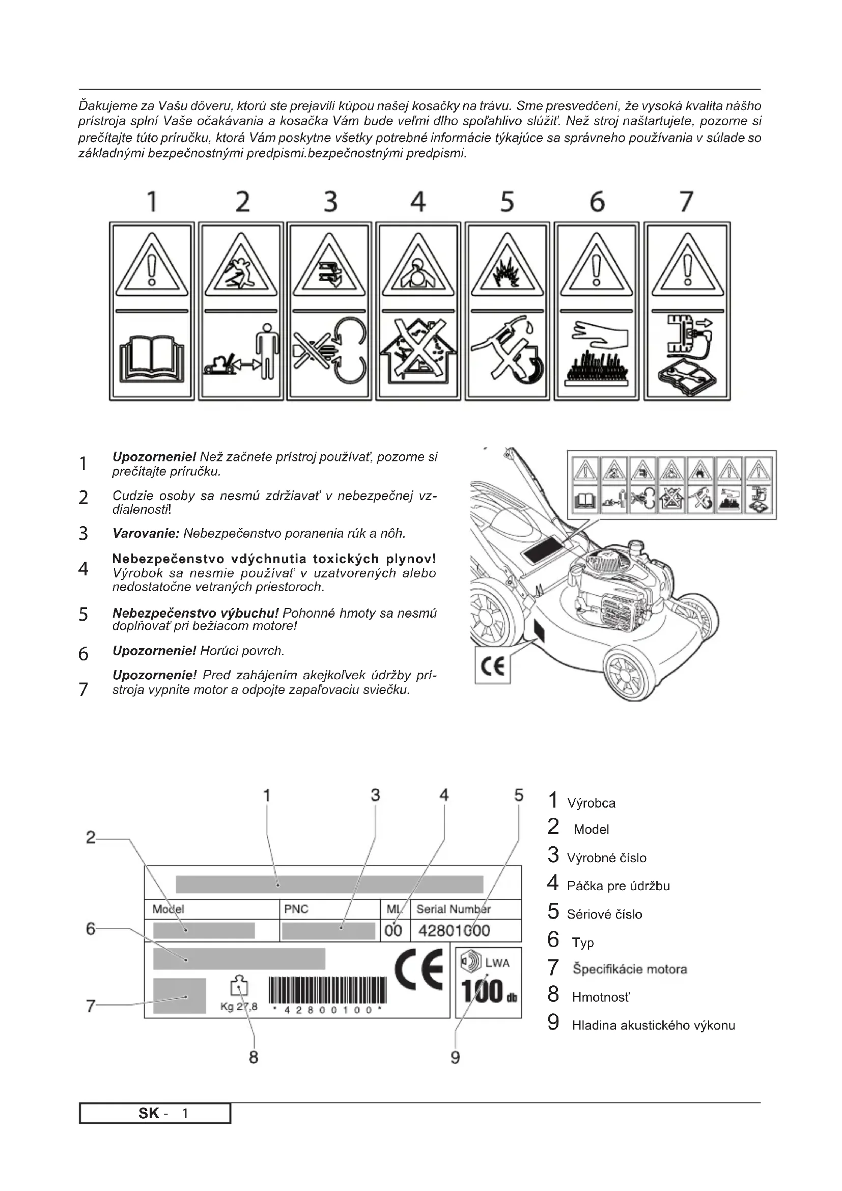 Upozornenie! Než začnete prístroj používať, pozorne si prečítajte príručku. Cudzie osoby sa nesmú zdržiavať v nebezpečnej vz- dialenosti! Varovanie: Nebezpečenstvo poranenia rúk a nôh. Nebezpečenstvo vdýchnutia toxických plynov! Výrobok sa nesmie používať v uzatvorených alebo nedostatočne vetraných priestoroch. Nebezpečenstvo výbuchu! Pohonné hmoty sa nesmú doplňovať pri bežiacom motore! Upozornenie! Horúci povrch. Upozornenie! Pred zahájením akejkoľvek údržby prí- stroja vypnite motor a odpojte zapaľovaciu sviečku. Ďakujeme za Vašu dôveru, ktorú ste prejavili kúpou našej kosačky na trávu. Sme presvedčení, že vysoká kvalita nášho prístroja splní Vaše očakávania a kosačka Vám bude veľmi dlho spoľahlivo slúžiť. Než stroj naštartujete, pozorne si prečítajte túto príručku, ktorá Vám poskytne všetky potrebné informácie týkajúce sa správneho používania v súlade so základnými bezpečnostnými predpismi.bezpečnostnými predpismi. 1 Výrobca 2 Model 3 Výrobné číslo 4 Páčka pre údržbu 5 Sériové číslo 6 Typ