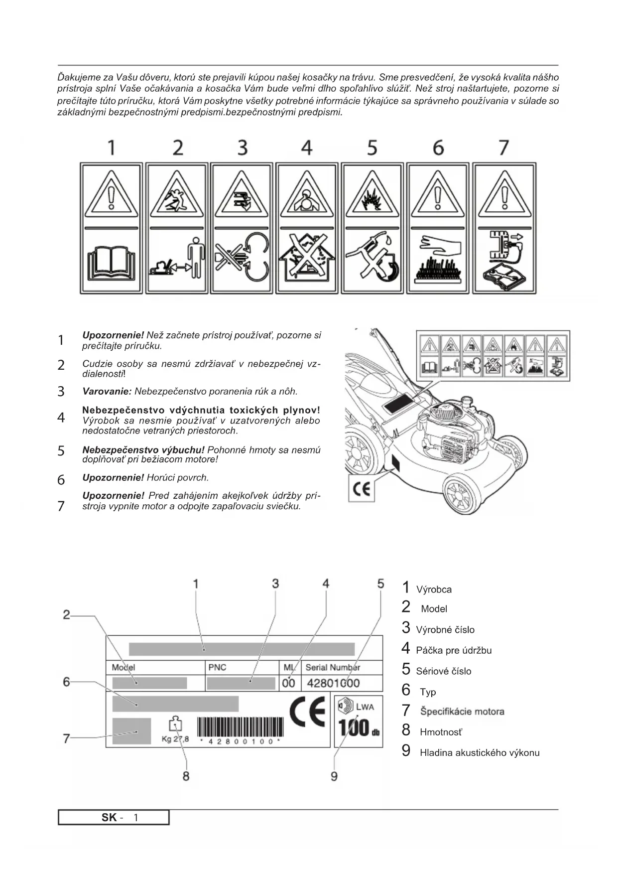 Upozornenie! Než začnete prístroj používať, pozorne si prečítajte príručku. Cudzie osoby sa nesmú zdržiavať v nebezpečnej vz- dialenosti! Varovanie: Nebezpečenstvo poranenia rúk a nôh. Nebezpečenstvo vdýchnutia toxických plynov! Výrobok sa nesmie používať v uzatvorených alebo nedostatočne vetraných priestoroch. Nebezpečenstvo výbuchu! Pohonné hmoty sa nesmú doplňovať pri bežiacom motore! Upozornenie! Horúci povrch. Upozornenie! Pred zahájením akejkoľvek údržby prí- stroja vypnite motor a odpojte zapaľovaciu sviečku. Ďakujeme za Vašu dôveru, ktorú ste prejavili kúpou našej kosačky na trávu. Sme presvedčení, že vysoká kvalita nášho prístroja splní Vaše očakávania a kosačka Vám bude veľmi dlho spoľahlivo slúžiť. Než stroj naštartujete, pozorne si prečítajte túto príručku, ktorá Vám poskytne všetky potrebné informácie týkajúce sa správneho používania v súlade so základnými bezpečnostnými predpismi.bezpečnostnými predpismi. 1 Výrobca 2 Model 3 Výrobné číslo 4 Páčka pre údržbu 5 Sériové číslo 6 Typ