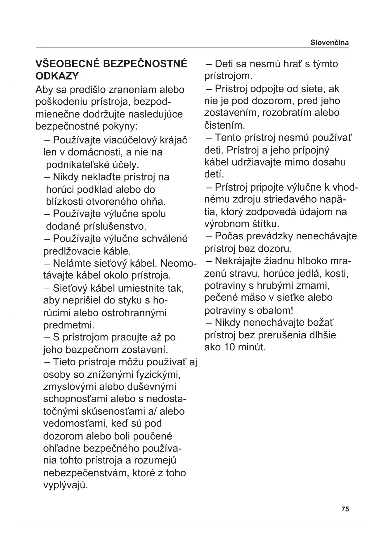 ODKAZY Aby sa predišlo zraneniam alebo poškodeniu prístroja, bezpod- mienečne dodržujte nasledujúce bezpečnostné pokyny: – Používajte viacúčelový krájač len v domácnosti, a nie na podnikateľské účely. – Nikdy neklaďte prístroj na horúci podklad alebo do blízkosti otvoreného ohňa. – Používajte výlučne spolu dodané príslušenstvo. – Používajte výlučne schválené predlžovacie káble. – Nelámte sieťový kábel. Neomo- távajte kábel okolo prístroja. – Sieťový kábel umiestnite tak, aby neprišiel do styku s ho- rúcimi alebo ostrohrannými predmetmi. – S prístrojom pracujte až po jeho bezpečnom zostavení. – Tieto prístroje môžu používať aj osoby so zníženými fyzickými, zmyslovými alebo duševnými schopnosťami alebo s nedosta- točnými skúsenosťami a/ alebo vedomosťami, keď sú pod dozorom alebo boli poučené ohľadne bezpečného používa- nia tohto prístroja a rozumejú nebezpečenstvám, ktoré z toho vyplývajú. – Deti sa nesmú hrať s týmto prístrojom. – Prístroj odpojte od siete, ak nie je pod dozorom, pred jeho zostavením, rozobratím alebo čistením. – Tento prístroj nesmú používať deti. Prístroj a jeho prípojný kábel udržiavajte mimo dosahu detí. – Prístroj pripojte výlučne k vhod- nému zdroju striedavého napä- tia, ktorý zodpovedá údajom na výrobnom štítku. – Počas prevádzky nenechávajte prístroj bez dozoru. – Nekrájajte žiadnu hlboko mra- zenú stravu, horúce jedlá, kosti, potraviny s hrubými zrnami, pečené mäso v sieťke alebo potraviny s obalom! – Nikdy nenechávajte bežať prístroj bez prerušenia dlhšie ako 10 minút.76 Nebezpečenstvo zasiahnutia elektrickým prúdom – Pri každej prevádzkovej poruche, pred každým čistením a ak nie je prístroj v prevádzke, vždy vytiahnite sieťový kábel zo zástrčky. Neťahajte pritom za kábel, ale za zástrčku. – Nikdy neponárajte prístroj do vody. Nevystavujte prístroj daž- ďu alebo inej vlhkosti. V prípade, ak by prístroj pred- sa len spadol do vody, najprv vytiahnite koncovku zo zásuv- ky a až potom vyberte prístroj z vody. Pred opätovným uve- dením do prevádzky nechajte prístroj preskúšať schválenému servisnému miestu. – Nepoužívajte prístroj s vlhkými rukami. Nepoužívajte prístroj, ak je vlhký alebo mokrý alebo ak stojíte na vlhkej podlahe. Nepoužívajte prístroj vonku. – V prípade poškodenia častí prístroja okamžite zastavte prevádzku a skontaktujte sa so zákazníckou službou spoloč- nosti ritter. – Ak sa poškodí sieťový kábel, musí byť vymenený výrob- com, jeho servisnou službou alebo podobnými kvalikova- nými osobami, aby sa predišlo ohrozeniu. Nebezpečenstvo poranenia – Prístroj sa nesmie používať bez posúvača rezanej suroviny ale- bo bez prítlačnej dosky, iba ak veľkosť a tvar rezanej suroviny nedovoľuje ich použitie. – Pred výmenou príslušenstva alebo prídavných dielcov, ktoré sa počas prevádzky pohybujú, sa prístroj musí vypnúť a odpo- jiť od siete. – Kotúčový nôž je veľmi ostrý. – Pri prevádzke prístroja sa v žiadnom prípade nesmiete dotknúť kotúčového noža! – Pred čistením prístroj vypnite, vytiahnite zo siete a otočte regulátor hrúbky narezania do polohy „0“. – Po vypnutí kotúčový nôž ešte chvíľu dobieha. Slovenčina77 Slovenčina Vyberte obrázky na prednej a zadnej obálke príručky. Pred uvedením prístroja do prevádzky si starostlivo prečítajte návod. Uschovajte si návod na použitie a v prípade odovzdania prístroja inej osobe ho priložte k prístroju. Alternatívne je k dispozícii aktu- álny návod na použitie na stránke www.ritterwerk.de.