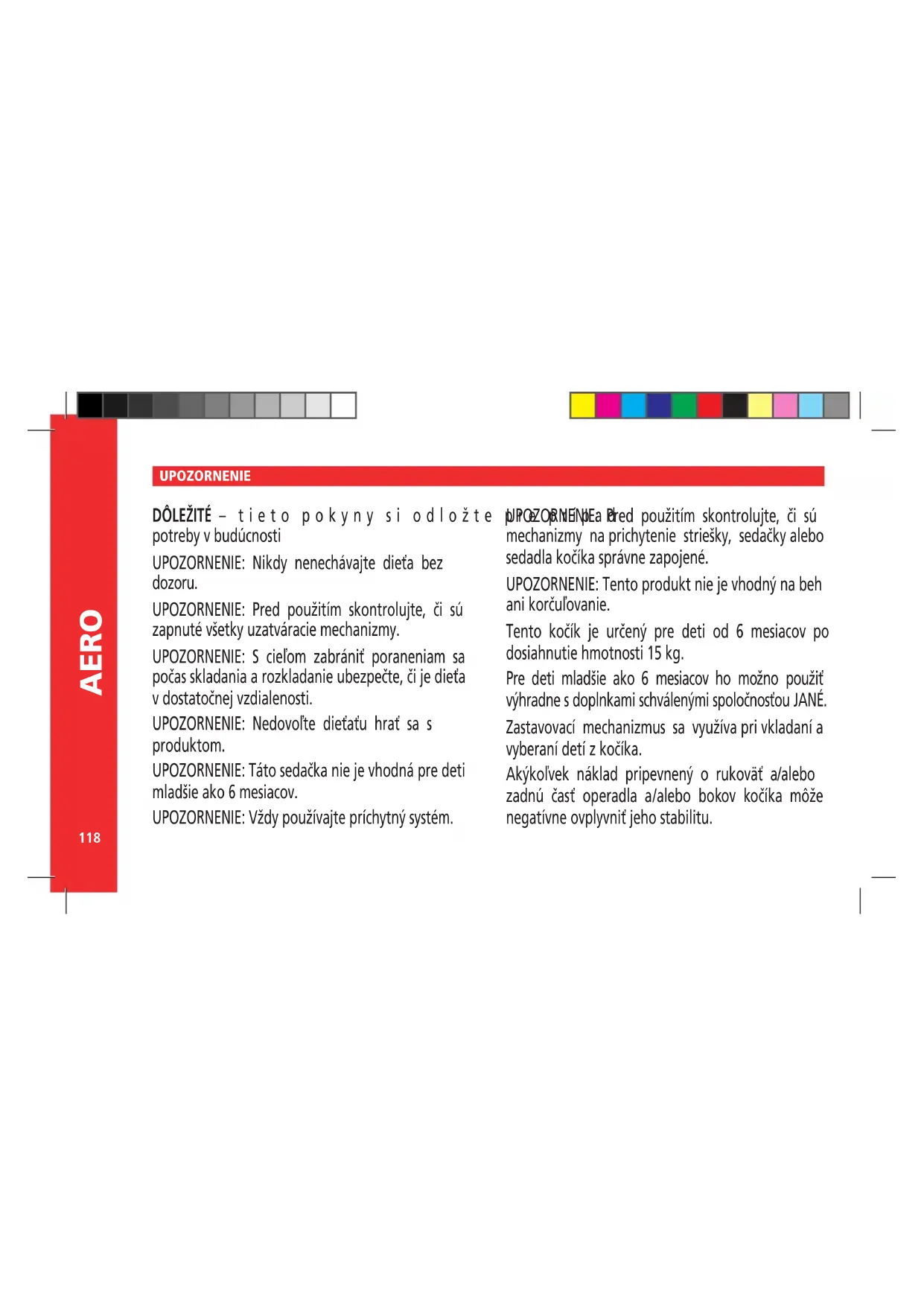 AERO UPOZORNENIE DÔLEŽITÉ – tieto pokyny si odložte pre prípad potreby v budúcnosti UPOZORNENIE: Nikdy nenechávajte dieťa bez dozoru. UPOZORNENIE: Pred použitím skontrolujte, či sú zapnuté všetky uzatváracie mechanizmy. UPOZORNENIE: S cieľom zabrániť poraneniam sa počas skladania a rozkladanie ubezpečte, či je dieťa v dostatočnej vzdialenosti. UPOZORNENIE: Nedovoľte dieťaťu hrať sa s produktom. UPOZORNENIE: Táto sedačka nie je vhodná pre deti mladšie ako 6 mesiacov. UPOZORNENIE: Vždy používajte príchytný systém. UPOZORNENIE: Pred použitím skontrolujte, či sú mechanizmy na prichytenie striešky, sedačky alebo sedadla kočíka správne zapojené. UPOZORNENIE: Tento produkt nie je vhodný na beh ani korčuľovanie. Tento kočík je určený pre deti od 6 mesiacov po dosiahnutie hmotnosti 15 kg. Pre deti mladšie ako 6 mesiacov ho možno použiť výhradne s doplnkami schválenými spoločnosťou JANÉ. Zastavovací mechanizmus sa využíva pri vkladaní a vyberaní detí z kočíka. Akýkoľvek náklad pripevnený o rukoväť a/alebo zadnú časť operadla a/alebo bokov kočíka môže negatívne ovplyvniť jeho stabilitu.119 slovensko Tento kočík je navrhnutý len pre jedno dieťa, nevozte v ňom naraz dve a viac detí. Nepoužívajte príslušenstvo, ktoré neschválila spoločnosť JANÉ. Pri autosedačkách, ktoré sa používajú aj s kostrou, tento kočík nenahrádza posteľ ani kolísku. Ak dieťa potrebuje spať, treba ho uložiť do primeranej hojdačky, postieľky alebo kolísky. Nikdy nepoužívajte náhradné diely, ktoré neschválila spoločosť JANÉ. Maximálna hmotnosť vecí uložených v košíku pod kočíkom nesmie nikdy presiahnuť hmotnosť uvedenú na košíku (4 kg). Kočík AERO rozložíte súčasným stlačením tlačidiel na ria- didlách. Po rozložení skontrolujte, či je zadné prekríženie celkom na- pnuté, pretože bráni mimovoľnému zloženiu kočíka. UPOZORNENIE: Je nevyhnutné uistiť sa, že sa dieťa nenachádza v blízkosti sedačky počas jej rozkladania a skladania. UPOZORNENIE: Pri týchto činnostiach nevyhnutne vznikajú riziká porezania, stlačenia a zachytenia. Kostra kočíka disponuje systémom PRO-FIX, preto na ňu môžete zasunúť ktorúkoľvek z nasledovných vaničiek: Koos, Matrix Light 2, Micro. Systém PRO FIX vám uľahčí nasadenie a odopnutie tohto príslušenstva ku konštrukcii, lebo jeho uchytenie je rýchle, jednoduché a bezpečné. Pritom pozorne postupujte podľa jednotlivých návodov k týmto príslušen- stvám. K systému PRO-FIX sa dostanete po rozopnutí spôn poťahu a vytiahnutí záklopiek, ktoré systém zakrývajú. Záklopky si od- ložte na bezpečné miesto a keď sedačku prestanete používať, znovu ich nasaďte na miesto. 3.1 - 3.2 1.- Rozloženie 2.- Systém Pro-FIX