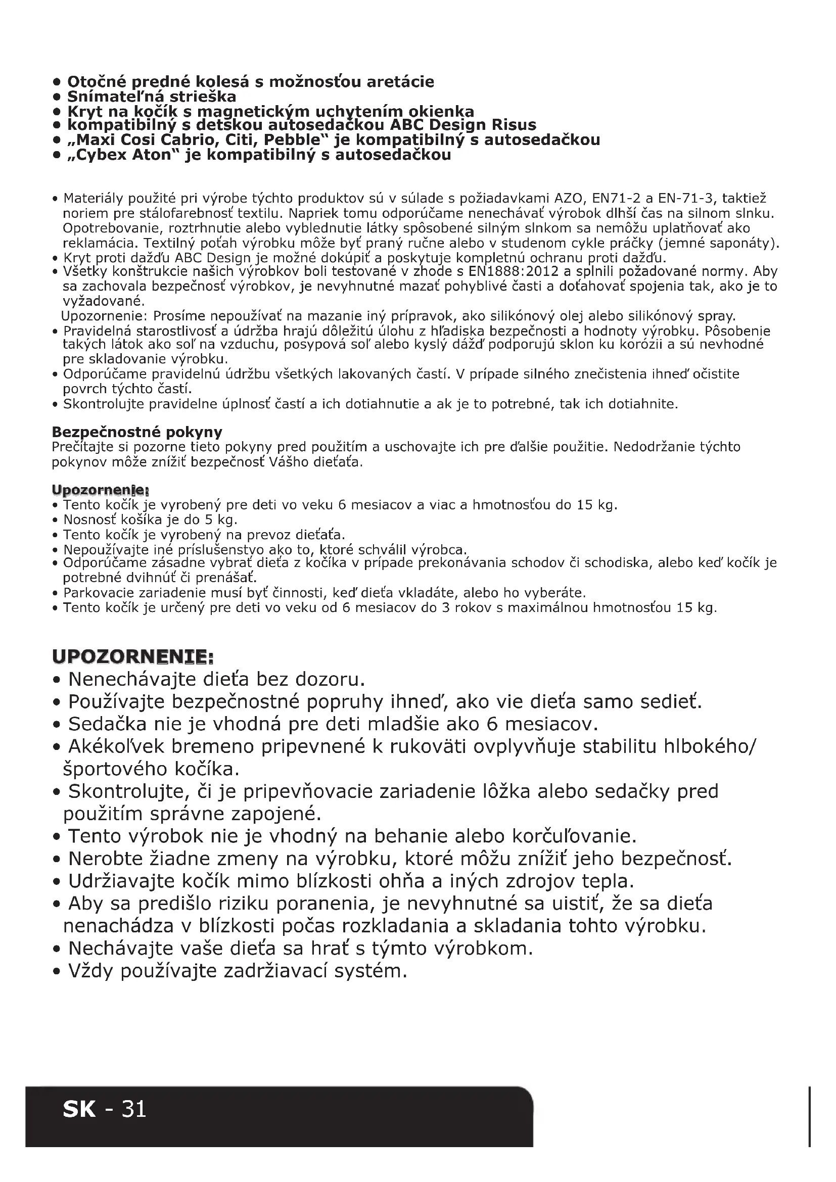 - Skontrolujte pravidelne úplnosť častí a ich dotiahnutie a ak je to potrebné, tak ich dotiahnite. Bezpečnostné pokyny Prečítajte si pozorne tieto pokyny pred použitím a uschovajte ich pre ďalšie použitie. Nedodržanie týchto pokynov môže znížiť bezpečnosť Vášho dieťaťa. Upozornenie:
