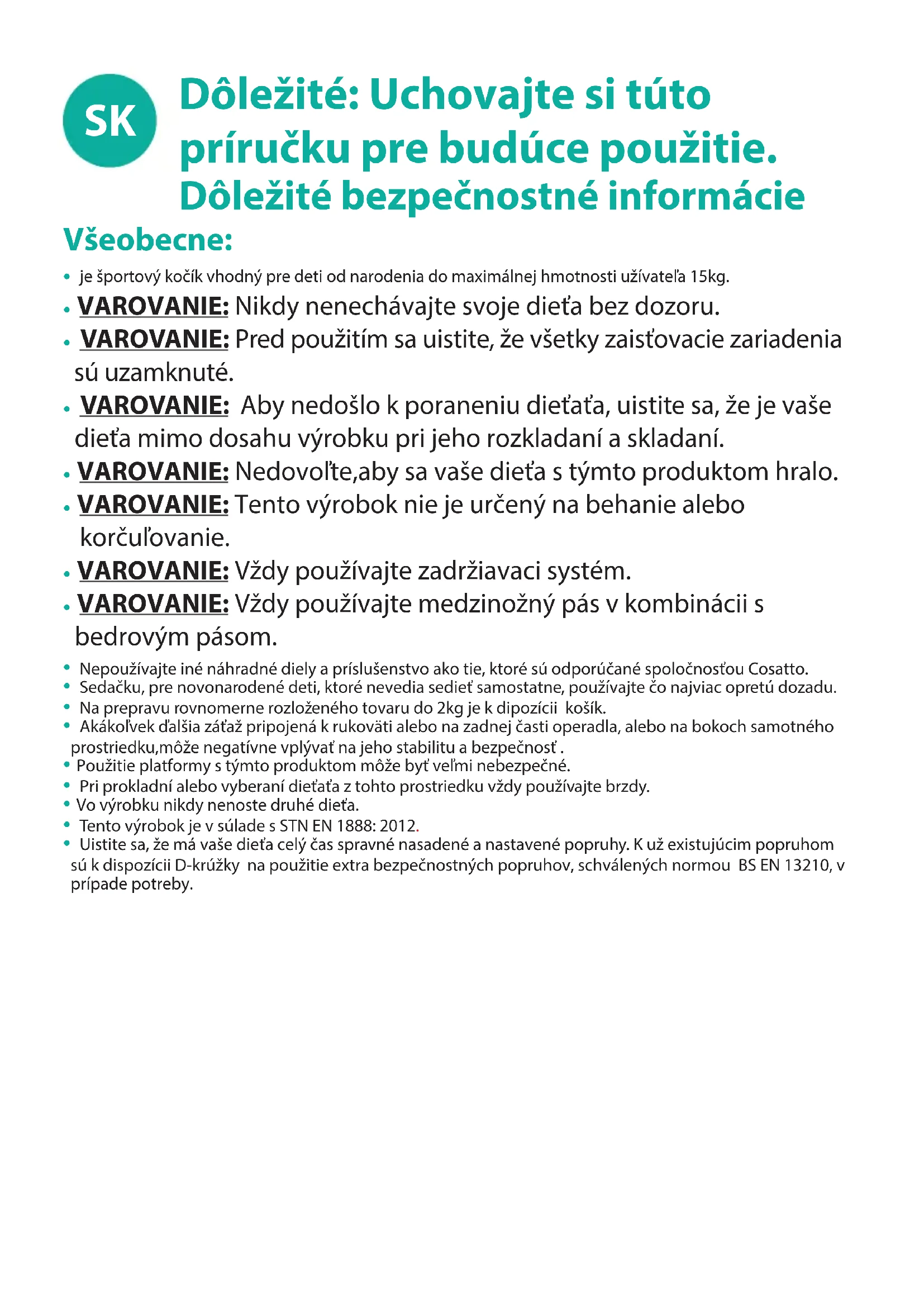 - Údržba - Pravidelne kontrolujte zaisťovacie zariadenia, brzdy, kolesá, popruhy, úchytky, nastavovacie páky sedadiel, spoje a príslušentsvo,aby ste sa uistili, či sú bezpečné a plne funkčné. Celý čas by mali byť voľne pohyblivé. Celú dobu by sa mali voľne pohybovať, s potrebou minimálnej údržby. Avšak, pravidelná ľahká aplikácia maziva v spreji, napr.: silikón( nepoužívajte nič mastné,ani olejové), predĺži život vašeho športového kočíka a uľahčí vám jeho rozkladanie a skladanie. Technický stav a údržba vášho kočíka by mali byť skontrolované pred použitím pre druhé dieťa alebo po 18 mesiacoch používania, ktorékoľvek z týchto dvoch možností sa stane skôr. Obráťte sa na varovanie XX Správny krok Nesprávny krok Počuteľný zvuk Zopakujte krok x-krát Ukazovateľ všeobecných opatrení Zamknúť Odomknúť Stlačiť a podržať Kontrola Pokračujte krokom XX Zopakujte na druhej strane Vizuálny jazykový kľúč: Zoznam dielov: S1: Penová rukoväť S2: Príchlop rukoväte S3: Strecha S4: Чехол сиденья S5: doska operadla(sada) Pre tento produkt sú k dispozícii doleuvedené náhradné diely. Zákazníci zo Spojeného kráľovstva a Írska si ich môžu objednať na tejto webovej stránke: http://www.cosatto.com/service-centre/spares Pre zákazníkov mimo Spojeného kráľovstva a Írska sú kontaktné informácie miestnych obchodných zástupcov k dispozícii na http://www.cosatto.com/stockists Ak vyžadujete ďalšiu pomoc, kontaktujte nás na cuddle@cosatto.com Náhradné diely: P1: Kočík P2: Strecha P3: Nepremokavý plášť S6: Popruhy S7: Nepremokavý plášť S8: Predné koleso S9: Podnožka S10: Kryt kolesa S11: Košík S12: Zadné koleso S13: Automatické uzamknutieProsím, postupujte podľa nasledujúcich schém: Kočík Brzdy Sklopná brzda predného kolesa Rukoväť Popruhy Operadlo Opora lýtok Košík Strecha Nepremokavý plášť Kryt sedadla Kočík