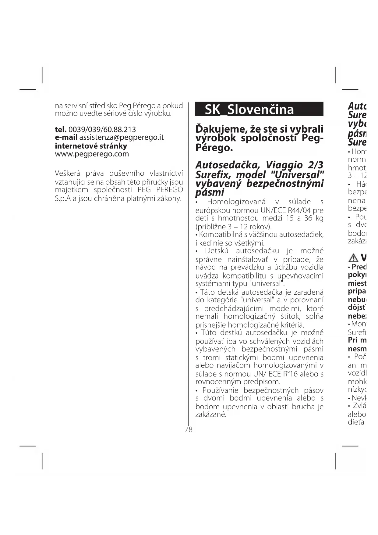 - Zvláštnu pozornosť venujte batožine alebo iným predmetom, ktoré by mohli dieťa sediace v autosedačke počas79 SK_Slovenčina Ďakujeme, že ste si vybrali výrobok spoločnosti Peg- Pérego. Autosedačka, Viaggio 2/3 Surefix, model "Universal" vybavený bezpečnostnými pásmi