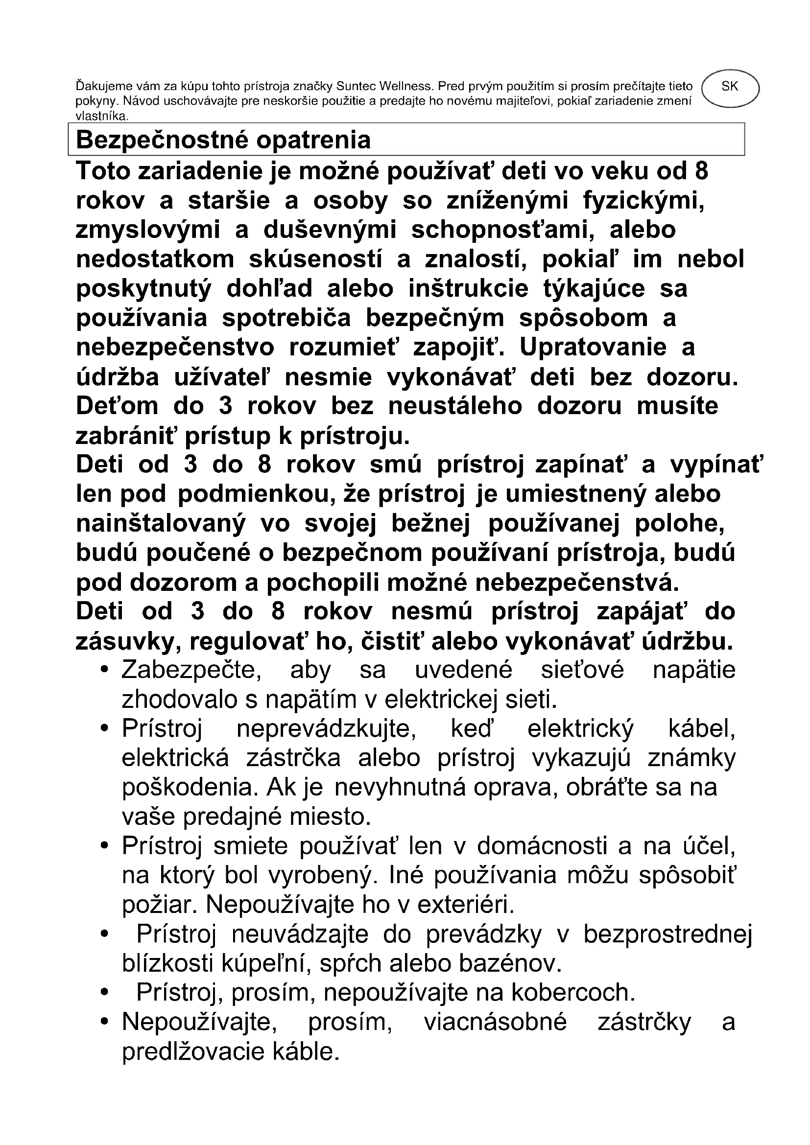 - V prípade uplatňovania nároku vyplývajúceho zo záruky prineste prosím prístroj k Vášmu predajcovi a pôvodnom obale a s dokladom o kúpe. Pre aktuálne a pohodlné nahlásenie služby prosím navštívte našu webovú stránku www.suntec-wellness.de a dozviete sa viac.