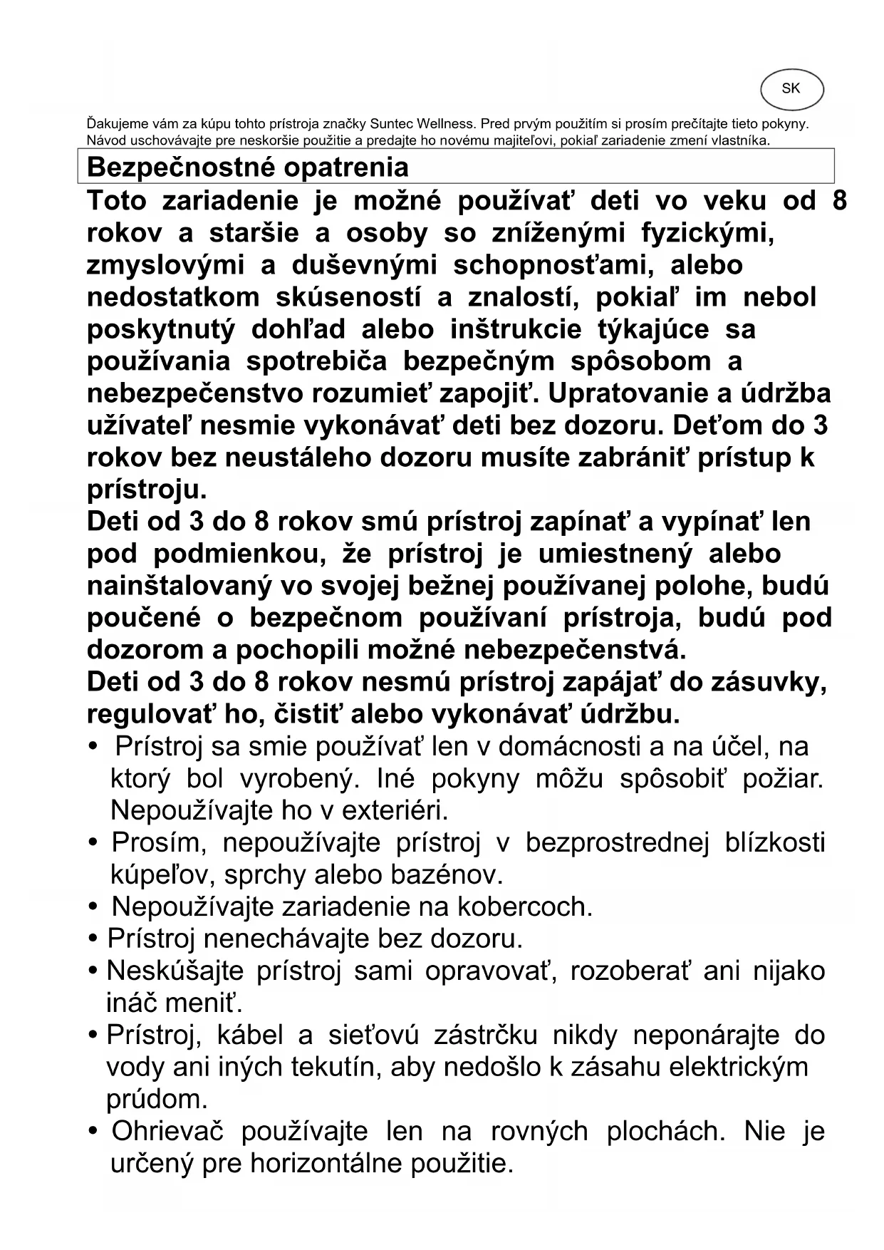 Ďakujeme vám za kúpu tohto prístroja značky Suntec Wellness. Pred prvým použitím si prosím prečítajte tieto pokyny. Návod uschovávajte pre neskoršie použitie a predajte ho novému majiteľovi, pokiaľ zariadenie zmení vlastníka. Bezpečnostné opatrenia Toto zariadenie je možné používať deti vo veku od 8 rokov a staršie a osoby so zníženými fyzickými, zmyslovými a duševnými schopnosťami, alebo nedostatkom skúseností a znalostí, pokiaľ im nebol poskytnutý dohľad alebo inštrukcie týkajúce sa používania spotrebiča bezpečným spôsobom a nebezpečenstvo rozumieť zapojiť. Upratovanie a údržba užívateľ nesmie vykonávať deti bez dozoru. Deťom do 3 rokov bez neustáleho dozoru musíte zabrániť prístup k prístroju. Deti od 3 do 8 rokov smú prístroj zapínať a vypínať len pod podmienkou, že prístroj je umiestnený alebo nainštalovaný vo svojej bežnej používanej polohe, budú poučené o bezpečnom používaní prístroja, budú pod dozorom a pochopili možné nebezpečenstvá. Deti od 3 do 8 rokov nesmú prístroj zapájať do zásuvky, regulovať ho, čistiť alebo vykonávať údržbu. Prístroj sa smie používať len v domácnosti a na účel, na ktorý bol vyrobený. Iné pokyny môžu spôsobiť požiar. Nepoužívajte ho v exteriéri. Prosím, nepoužívajte prístroj v bezprostrednej blízkosti kúpeľov, sprchy alebo bazénov. Nepoužívajte zariadenie na kobercoch. Prístroj nenechávajte bez dozoru. Neskúšajte prístroj sami opravovať, rozoberať ani nijako ináč meniť. Prístroj, kábel a sieťovú zástrčku nikdy neponárajte do vody ani iných tekutín, aby nedošlo k zásahu elektrickým prúdom. Ohrievač používajte len na rovných plochách. Nie je určený pre horizontálne použitie. Prístroj nepoužívajte priamo pod zásuvkou. Váš ohrievač nepoužívajte v blízkosti výbušných alebo horľavých látok. Prekontrolujte potenciál vašej miestnej siete a uistite sa, že svojimi hodnotami odpovedá údajom uvedeným na typovom štítku prístroja. V jednej zásuvke nepoužívajte viac vysoko výkonných zariadení. Dbajte na tesné pripojenie medzi zástrčkou a zásuvkou, aby ste tak zabránili prehriatiu zástrčky a zlyhaniu. Nepoužívajte žiadne zariadenia k naprogramovaniu prevádzky ohrievača, pretože to môže viesť k vzniku porúch. Sieťový kábel vyťahujte zo zásuvky vždy za zástrčku, nie za kábel samotný. Aby ste zabránili možnému nebezpečenstvu, nepoužívajte prístroj s poškodeným sieťovým káblom. Prístroj prineste späť k vášmu predajcovi a nechajte ho odborne vymeniť. Prístroj neprevádzkujte v blízkosti horúcich plôch. Vždy sa uistite, že prístroj stojí na vhodnom rovnom povrchu. Uistite sa, že nie sú blokované vsupy a výstupy vzduchu. Vykurovacie teleso nezakrývajte (napr. oblečením), aby ste sa vyhli akémukoľvek nebezpečenstvu vzniku požiaru. Cez mriežku neprestrkujte dovnútra žiadne predmety.