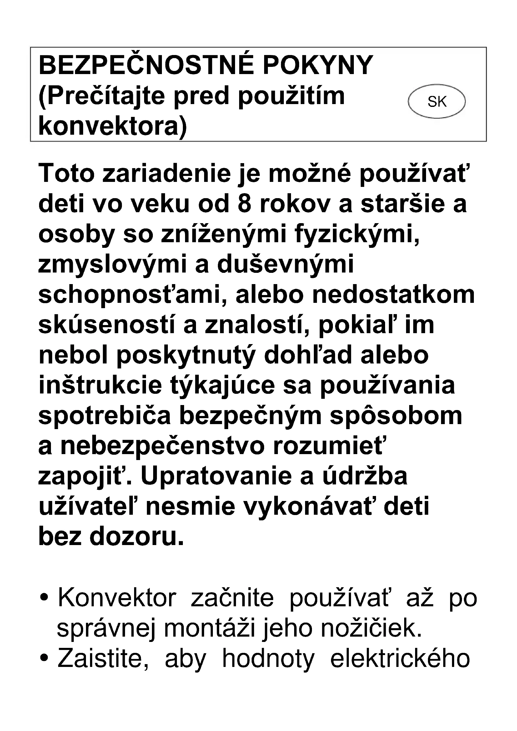 Izjava o skladnosti ES:BEZPEČNOSTNÉ POKYNY (Prečítajte pred použitím konvektora) Toto zariadenie je možné používať deti vo veku od 8 rokov a staršie a osoby so zníženými fyzickými, zmyslovými a duševnými schopnosťami, alebo nedostatkom skúseností a znalostí, pokiaľ im nebol poskytnutý dohľad alebo inštrukcie týkajúce sa používania spotrebiča bezpečným spôsobom a nebezpečenstvo rozumieť zapojiť. Upratovanie a údržba užívateľ nesmie vykonávať deti bez dozoru. Konvektor začnite používať až po správnej montáži jeho nožičiek. Zaistite, aby hodnoty elektrického SKnapätia privádzaného k zásuvke, ku ktorej je konvektor pripojený, odpovedali typovému štítku a aby bola zásuvka uzemnená. Sieťová kábel neponechávajte v blízkosti teplého konvektora! Konvektor nikdy neumiestňujte v blízkosti vlhkých priestorov, príp. vodných zdrojov, pretože by mohol spadnúť do vane alebo iných zásobníkov na vodu. Konvektor nikdy nepoužívajte vonku. Nezakrývajte alebo neblokujte mriežku výstupu teplého vzduchu alebo prieduchy prijímaného vzduchu konvektora. Konvektor nestavajte na koberec s mäkkým chlpatým povrchom. Vždy zaistite, že konvektor bude umiestnený na stabilnú rovnúplochu. Neinštalujte ho v blízkosti závesov alebo nábytku, zabráni sa tam nebezpečenstvu vzniku požiaru. Konvektor neumiestňujte pred alebo priamo pod nástennú zásuvku. Do mriežky výstupu teplého vzduchu konvektora nestrkajte žiadne predmety. Konvektor nepoužívajte v priestoroch, kde sú uskladnené horľavé kvapaliny alebo kde je prítomný horľavý dym. Pri používaní konvektora musí byť venovaná obzvlášť pozornosť deťom a postihnutým osobám. Nebezpečenstvo poranenia! Pri premiestňovaní konvetora z jednoho miesta na druhé vždy vytiahnite jeho zástrčku zo zásuvky. V prípade poškodenia sieťovéhokábla konvektor nepoužívajte. Poškodený sieťový kábel musí byť vymenený autorizovaným zákazníckym servisom alebo kvalifikovanou osobou. V prípade poškodenia zástrčky sa riaďte pokynmi uvedenými nižšie. TECHNICKÉ CHARAKTERISTIKY HEAT FLOW 2000 - konvektor s termostatom HEAT FLOW 2010 - konvektor s termostatom a timerom HEAT FLOW 2020 - konvektor s termostatom a ventilátorom HEAT FLOW 2050 - konvektor s termostatom, timerom a ventilátorom MAX. PRÍKON: 2000 – 2200 W/ PROJEKTOVANÝ VÝKON: 700 – 1250 – 2000 W / VÝKON MOTORA: 20W / NAPÄTIE: 220 – 240 V~50Hz