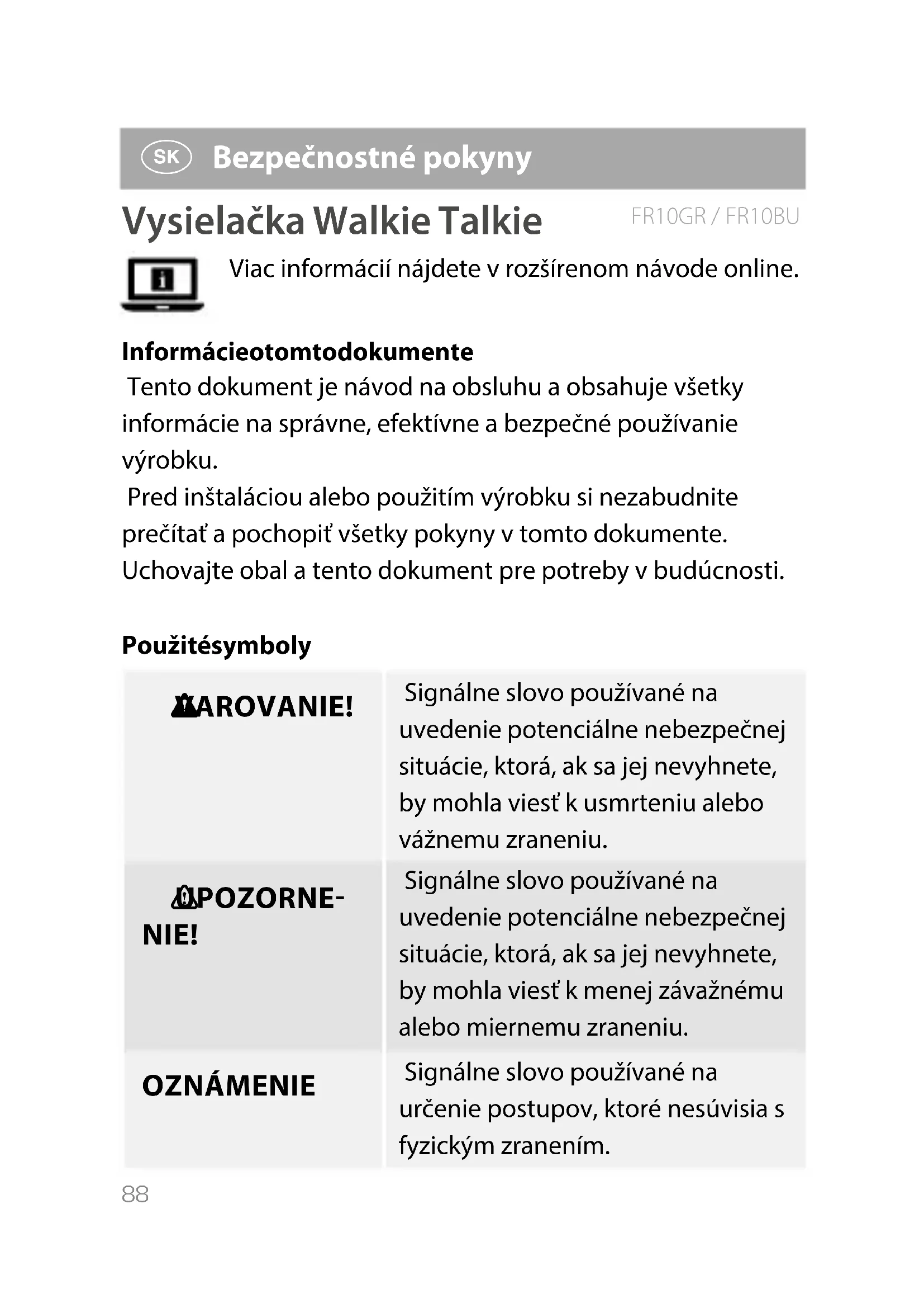 Bezpečnostné pokyny Vysielačka Walkie Talkie FR10GR / FR10BU Viac informácií nájdete v rozšírenom návode online. Informácie o tomto dokumente Tento dokument je návod na obsluhu a obsahuje všetky informácie na správne, efektívne a bezpečné používanie výrobku. Pred inštaláciou alebo použitím výrobku si nezabudnite prečítať a pochopiť všetky pokyny v tomto dokumente. Uchovajte obal a tento dokument pre potreby v budúcnosti. Použité symboly VAROVANIE! Signálne slovo používané na uvedenie potenciálne nebezpečnej situácie, ktorá, ak sa jej nevyhnete, by mohla viesť k usmrteniu alebo vážnemu zraneniu. UPOZORNE- NIE! Signálne slovo používané na uvedenie potenciálne nebezpečnej situácie, ktorá, ak sa jej nevyhnete, by mohla viesť k menej závažnému alebo miernemu zraneniu. OZNÁMENIE Signálne slovo používané na určenie postupov, ktoré nesúvisia s fyzickým zranením.89Alecto | Safety instructions Technické údaje Špecikácia Hodnota Vstup napájania 5 V DC / 2000 mA (USB adaptér nie je súčasťou dodávky) Typ batérie 3 × 1.2 V 800 mAh Určené použitie Tento výrobok je určený ako bezdrôtové komunikačné zariadenie, ktoré umožňuje používateľom komunikovať na vzdialenosť až 6 km v podmienkach voľného terénu. Tento výrobok je určený na použitie vo vnútornom a vonkajšom prostredí. Každá zmena výrobku môže mať následky na bezpečnosť, záruku a správne fungovanie. Tento výrobok nie je určený na profesionálne použitie. Bezpečnostné pokyny Pred inštaláciou alebo použitím výrobku si nezabudnite prečítať a pochopiť všetky pokyny v tomto dokumente. Uchovajte obal a tento dokument pre potreby v budúcnosti.