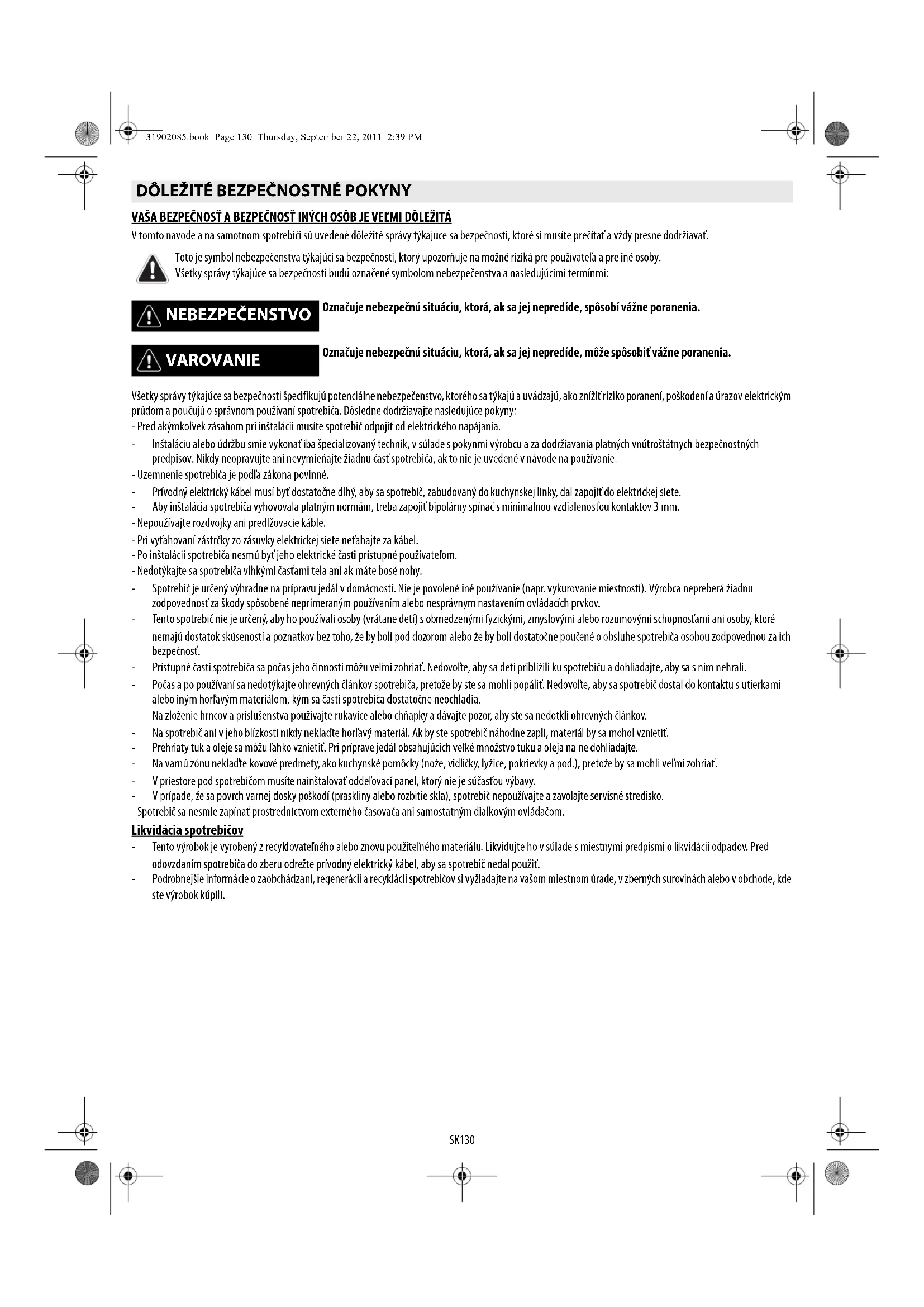 Krém Uvedení mléka do varu 4-5 Udržování lehkého varu 4-5 Nákypy Uvedení mléka do varu 4-5 Udržování lehkého varu 2-3 Rýžová kaše Ohřev mléka 5-6 Vaření 2-3 31902085.book Page 129 Thursday, September 22, 2011 2:39 PMSK130 VAŠA BEZPEČNOSŤ A BEZPEČNOSŤ INÝCH OSÔB JE VEĽMI DÔLEŽITÁ V tomto návode a na samotnom spotrebiči sú uvedené dôležité správy týkajúce sa bezpečnosti, ktoré si musíte prečítať a vždy presne dodržiavať. Všetky správy týkajúce sa bezpečnosti špecifikujú potenciálne nebezpečenstvo, ktorého sa týkajú a uvádzajú, ako znížiť riziko poranení, poškodení a úrazov elektrickým prúdom a poučujú o správnom používaní spotrebiča. Dôsledne dodržiavajte nasledujúce pokyny: - Pred akýmkoľvek zásahom pri inštalácii musíte spotrebič odpojiť od elektrického napájania. - Inštaláciu alebo údržbu smie vykonať iba špecializovaný technik, v súlade s pokynmi výrobcu a za dodržiavania platných vnútroštátnych bezpečnostných predpisov. Nikdy neopravujte ani nevymieňajte žiadnu časť spotrebiča, ak to nie je uvedené v návode na používanie. - Uzemnenie spotrebiča je podľa zákona povinné. - Prívodný elektrický kábel musí byť dostatočne dlhý, aby sa spotrebič, zabudovaný do kuchynskej linky, dal zapojiť do elektrickej siete. - Aby inštalácia spotrebiča vyhovovala platným normám, treba zapojiť bipolárny spínač s minimálnou vzdialenosťou kontaktov 3 mm. - Nepoužívajte rozdvojky ani predlžovacie káble. - Pri vyťahovaní zástrčky zo zásuvky elektrickej siete neťahajte za kábel. - Po inštalácii spotrebiča nesmú byť jeho elektrické časti prístupné používateľom. - Nedotýkajte sa spotrebiča vlhkými časťami tela ani ak máte bosé nohy. - Spotrebič je určený výhradne na prípravu jedál v domácnosti. Nie je povolené iné používanie (napr. vykurovanie miestností). Výrobca nepreberá žiadnu zodpovednosť za škody spôsobené neprimeraným používaním alebo nesprávnym nastavením ovládacích prvkov. - Tento spotrebič nie je určený, aby ho používali osoby (vrátane detí) s obmedzenými fyzickými, zmyslovými alebo rozumovými schopnosťami ani osoby, ktoré nemajú dostatok skúseností a poznatkov bez toho, že by boli pod dozorom alebo že by boli dostatočne poučené o obsluhe spotrebiča osobou zodpovednou za ich bezpečnosť. - Prístupné časti spotrebiča sa počas jeho činnosti môžu veľmi zohriať. Nedovoľte, aby sa deti priblížili ku spotrebiču a dohliadajte, aby sa s ním nehrali. - Počas a po používaní sa nedotýkajte ohrevných článkov spotrebiča, pretože by ste sa mohli popáliť. Nedovoľte, aby sa spotrebič dostal do kontaktu s utierkami alebo iným horľavým materiálom, kým sa časti spotrebiča dostatočne neochladia. - Na zloženie hrncov a príslušenstva používajte rukavice alebo chňapky a dávajte pozor, aby ste sa nedotkli ohrevných článkov. - Na spotrebič ani v jeho blízkosti nikdy neklaďte horľavý materiál. Ak by ste spotrebič náhodne zapli, materiál by sa mohol vznietiť. - Prehriaty tuk a oleje sa môžu ľahko vznietiť. Pri príprave jedál obsahujúcich veľké množstvo tuku a oleja na ne dohliadajte. - Na varnú zónu neklaďte kovové predmety, ako kuchynské pomôcky (nože, vidličky, lyžice, pokrievky a pod.), pretože by sa mohli veľmi zohriať. - V priestore pod spotrebičom musíte nainštalovať oddeľovací panel, ktorý nie je súčasťou výbavy. - V prípade, že sa povrch varnej dosky poškodí (praskliny alebo rozbitie skla), spotrebič nepoužívajte a zavolajte servisné stredisko. - Spotrebič sa nesmie zapínať prostredníctvom externého časovača ani samostatným diaľkovým ovládačom. Likvidácia spotrebičov - Tento výrobok je vyrobený z recyklovateľného alebo znovu použiteľného materiálu. Likvidujte ho v súlade s miestnymi predpismi o likvidácii odpadov. Pred odovzdaním spotrebiča do zberu odrežte prívodný elektrický kábel, aby sa spotrebič nedal použiť. - Podrobnejšie informácie o zaobchádzaní, regenerácii a recyklácii spotrebičov si vyžiadajte na vašom miestnom úrade, v zberných surovinách alebo v obchode, kde ste výrobok kúpili.