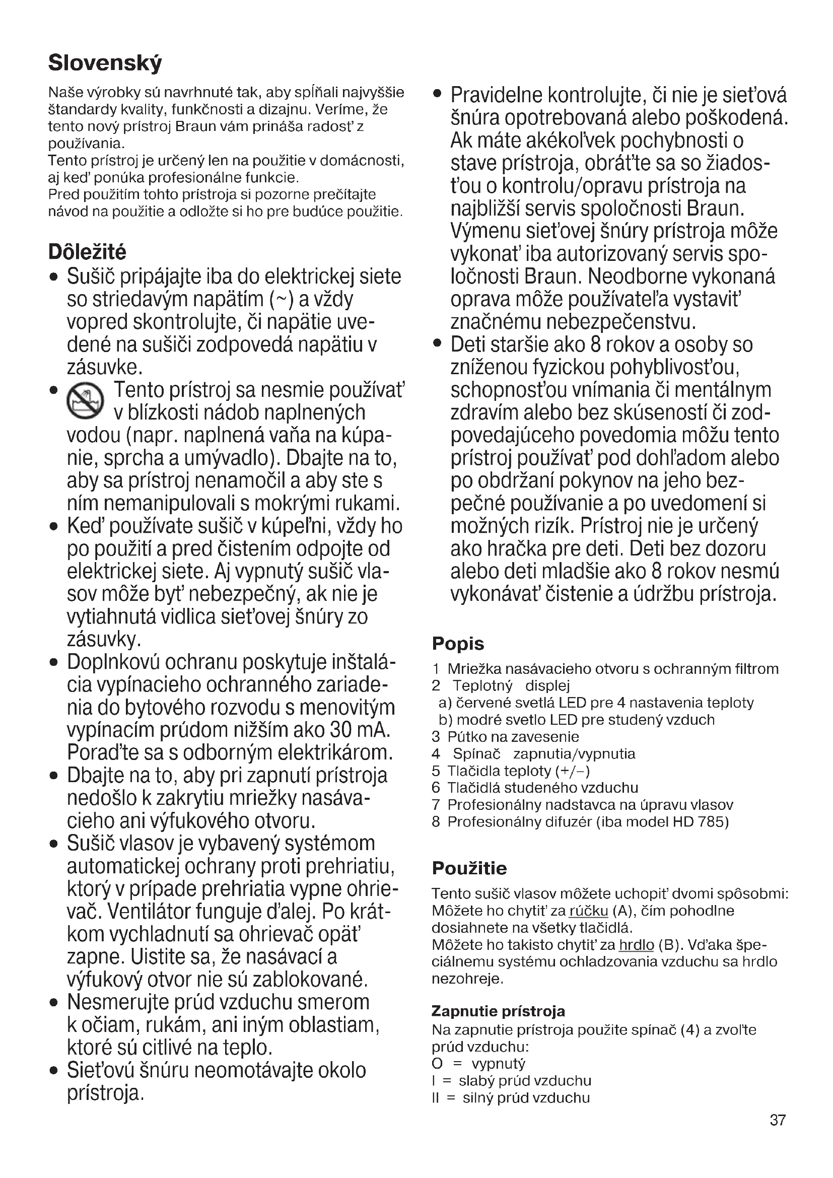 Deti staršie ako 8 rokov a osoby so zníženou fyzickou pohyblivosťou, schopnosťou vnímania či mentálnym zdravím alebo bez skúseností či zod- povedajúceho povedomia môžu tento prístroj používať pod dohľadom alebo po obdržaní pokynov na jeho bez- pečné používanie a po uvedomení si možných rizík. Prístroj nie je určený ako hračka pre deti. Deti bez dozoru alebo deti mladšie ako 8 rokov nesmú vykonávať čistenie a údržbu prístroja. Popis 1 Mriežka nasávacieho otvoru s ochranným filtrom 2 Teplotný displej a) červené svetlá LED pre 4 nastavenia teploty b) modré svetlo LED pre studený vzduch 3 Pútko na zavesenie 4 Spínač zapnutia/vypnutia 5 Tlačidla teploty (+/–) 6 Tlačidlá studeného vzduchu 7 Profesionálny nadstavca na úpravu vlasov 8 Profesionálny difuzér (iba model HD 785) Použitie Tento sušič vlasov môžete uchopiť dvomi spôsobmi: Môžete ho chytiť za rúčku (A), čím pohodlne dosiahnete na všetky tlačidlá. Môžete ho takisto chytiť za hrdlo (B). Vďaka špe- ciálnemu systému ochladzovania vzduchu sa hrdlo nezohreje. Zapnutie prístroja Na zapnutie prístroja použite spínač (4) a zvoľte prúd vzduchu: O = vypnutý I = slabý prúd vzduchu II = silný prúd vzduchu 96797320_HD785-780_S4-70.indd 3796797320_HD785-780_S4-70.indd 37 07.04.14 08:3807.04.14 08:38 CSS APPROVED Effective Date 8Apr2014 GMT - Printed 18Aug2014 Page 37 of 7038 Teplotný displej (2) Červené svetlá LED (2a) zobrazujú nastavenia teploty v rozsahu 1 (nízka) až 4 (vysoká). Modré svetlo LED (2b) sa zapne, ak stlačíte jedno z tlačidiel studeného vzduchu (6). Nastavenie teploty Po zapnutí prístroja sa nastaví tá teplota, ktorú ste zvolili naposledy. Ak chcete zmeniť teplotu, použite tlačidlá zmeny teploty (5): Na zvýšenie teploty stlačte tlačidlo +. Na zvýšenie teploty stlačte tlačidlo –. V závislosti od vašej citlivosti na teplo, typu a vlhkosti vlasov si môžete vybrať vašu obľúbenú teplotu. Integrovaný teplotný senzor zaisťuje maximálnu kontrolu teploty. Ochladzovací stupeň Tlačidlá studeného vzduchu (6) umožňujú v prípade potreby zafixovania tvaru účesu okamžité prepnutie na prúd studeného vzduchu. Obe tlačidlá ponúkajú tú istú funkciu. V závislosti od vášho obľúbeného spôsobu uchopenia prístroja (A alebo B) stlačte to tlačidlo studeného vzduchu, ktoré je vám bližšie na dosah. Studený vzduch sa rozprúdi bez ohľadu na počia- točnú teplotu a rozsvieti sa modré svetlo LED. Ak chcete pokračovať v práci so sušičom pri posle- dnej nastavenej teplote, ktorú zobrazujú červené svetlá LED, znovu stlačte jedno z tlačidiel studeného vzduchu. Iónová technológia (iba model HD 785) Prúd vzduchu je obohatený o milióny aktívnych iónov, ktoré obalia každý jeden vlas, znižujú výskyt rozstrapatených vlasov a statickú energiu. Vlasy je možné ľahšie upraviť, obnoví sa ich vlhkosť a prirodzený lesk. Aby ste zabezpečili maximálne prúdenie iónov, používajte sušič vlasov bez nadsta- vcov alebo úpravu účesov aspoň dokončite bez nadstavcov. Používanie nadstavca na úpravu vlasov Na úpravu vlasov nasaďte nadstavec na úpravu vlasov (7) do prednej časti prístroja a pevne ho zatlačte, až kým nezapadne na svoje miesto. Nadstavec na úpravu vlasov vám umožní nasmero- vať prúd vzduchu na jednotlivé časti vlasov. Nezabudnite, že na rozdiel od hrdla sušiča sa nadstavec na úpravu vlasov zohrieva od teplého prúdu vzduchu. Používanie difuzéra (iba model HD 785) Aby ste nadvihli vlasy pri korienkoch, dodali účesu objem alebo vytvorili prirodzené vlny, pripojte difuzér (8). Pevne ho zatlačte do nasávacieho otvoru vzdu- chu, až kým nezapadne na svoje miesto (C). Krátke až polodlhé vlasy: Aby ste účesu dodali objem a nadvihli vlasy pri korienkoch, pomaly pohybujte prstami nadstavca malými krúživými pohybmi po pokožke hlavy. Dlhé vlasy: Najskôr vysušte končeky vlasov položením na plochu s prstami nadstavca. Potom príslušnú časť vlasov opatrne zdvihnite s difuzérom ku hlave a pridržte. Vysušte tiež korienky tým, že budete jemne malými krúživými pohybmi prechádzať prstami difuzéra po pokožke hlavy, čím účes získa objem. Čistenie Pred čistením odpojte prístroj zo zásuvky a nechajte ho vychladnúť. Na čistenie plášťa prístroja používajte iba navlh- čenú utierku. Za žiadnych okolností nepoužívajte agresívne ani abrazívne čistiace prostriedky. Na odstránenie prachu alebo cudzích telies vo vnútri prístroja nikdy nepoužívajte špicaté predmety (napr. rúčku hrebeňa). Vystavujete sa nebezpečenstvu zásahu elektrickým prúdom. Pomocou navlhčenej utierky (D) pravidelne vyčistite vonkajšiu časť ochranného filtra (1). Na dôkladné vyčistenie prístroja otočte ochranným filtrom doľava a odstráňte ho z prístroja (E). Vyčistite ochranný filter pod tečúcou vodou a nechajte ho uschnúť. Opäť nasaďte ochranný filter a otočením doprava ho zaistite. Skladovanie Pútko na zavesenie (3) vám poskytuje praktický a bezpečný spôsob skladovania sušiča vlasov. Likvidácia Tento výrobok obsahuje recyklovateľný elektronický odpad. V záujme ochrany životného prostredia ho nevyhadzujte do domáceho odpadu, ale zaneste ho na príslušné zberné miesto vo vašom okolí. Právo na zmeny vyhradené. Deklarovaná hodnota emisie hluku tohto spotřebiča je 79 dB(A), čo predstavuje hladinu A akustického výkonu vzhľadom na referenčný akustický výkon 1 pW. 96797320_HD785-780_S4-70.indd 3896797320_HD785-780_S4-70.indd 38 07.04.14 08:3807.04.14 08:38 CSS APPROVED Effective Date 8Apr2014 GMT - Printed 18Aug2014 Page 38 of 7039 Záruka Poskytujeme dvojročnú záruku na výrobok s platnosťou od dátumu jeho zakúpenia. V záručnej lehote bezplatne odstránime všetky poruchy prístroja zapríčinené chybou materiálu alebo výroby, a to buď 