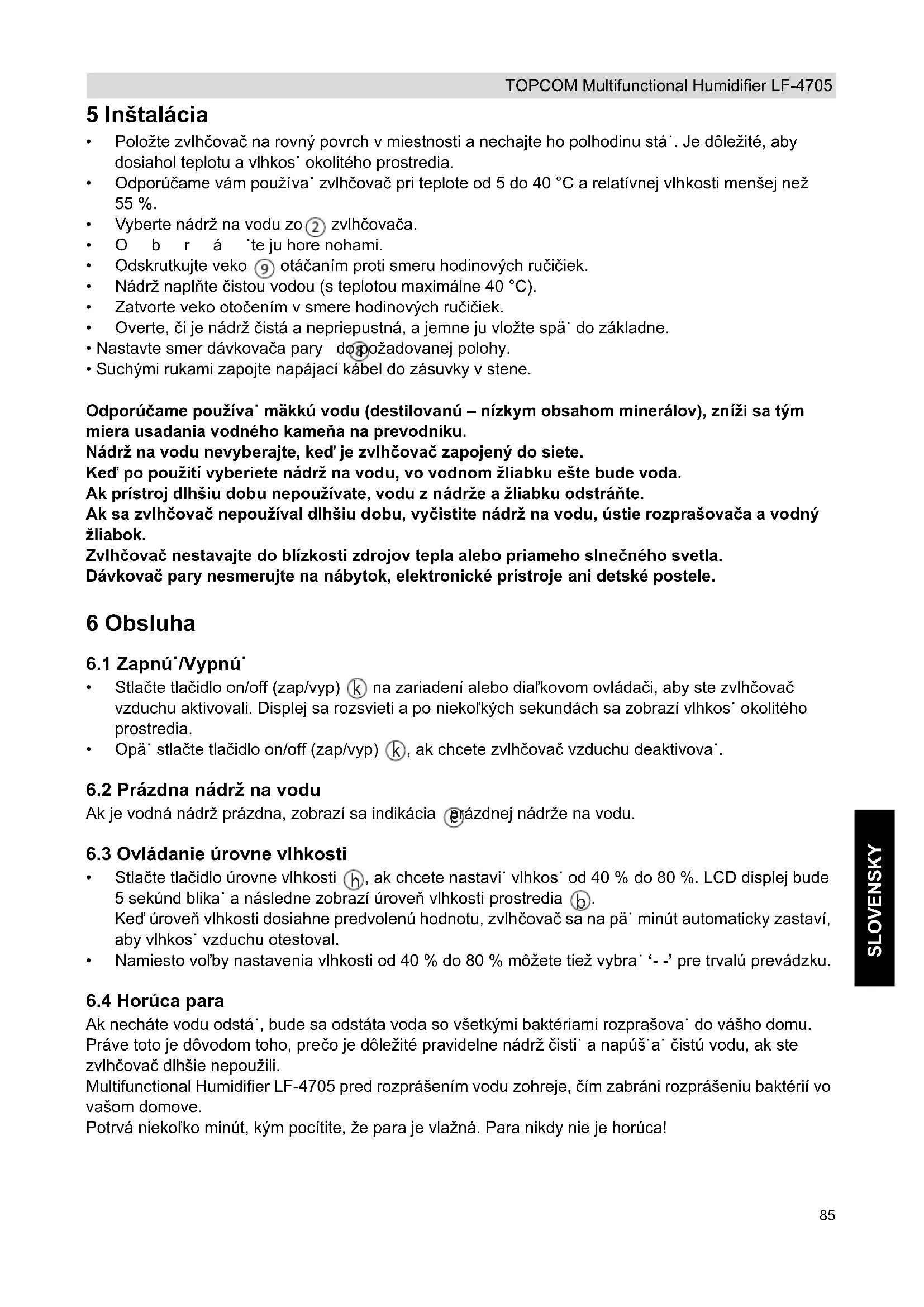 - Zvlhčovač nepoužívajte, ak už vzduch v miestnosti je dostatočne vlhký (minimálne 50% relatívna vlhkos˙). Prílišná vlhkos˙ zapríčiňuje zrážanie na studených povrchoch alebo stenách miestnosti.84 TOPCOM Multifunctional Humidifier LF-4705 2 Technické údaje – Kapacita vlhkosti: 400 ml/h (horúca para) / 300 ml/h (studená para) – Objem nádrže na vodu: 6 l – Menovité napätie: 230 V AC – Menovitá frekvencia: 50 Hz – Menovitý výkon: 130 W – Ochrana pred elektrickým šokom: skupina II 3Popis