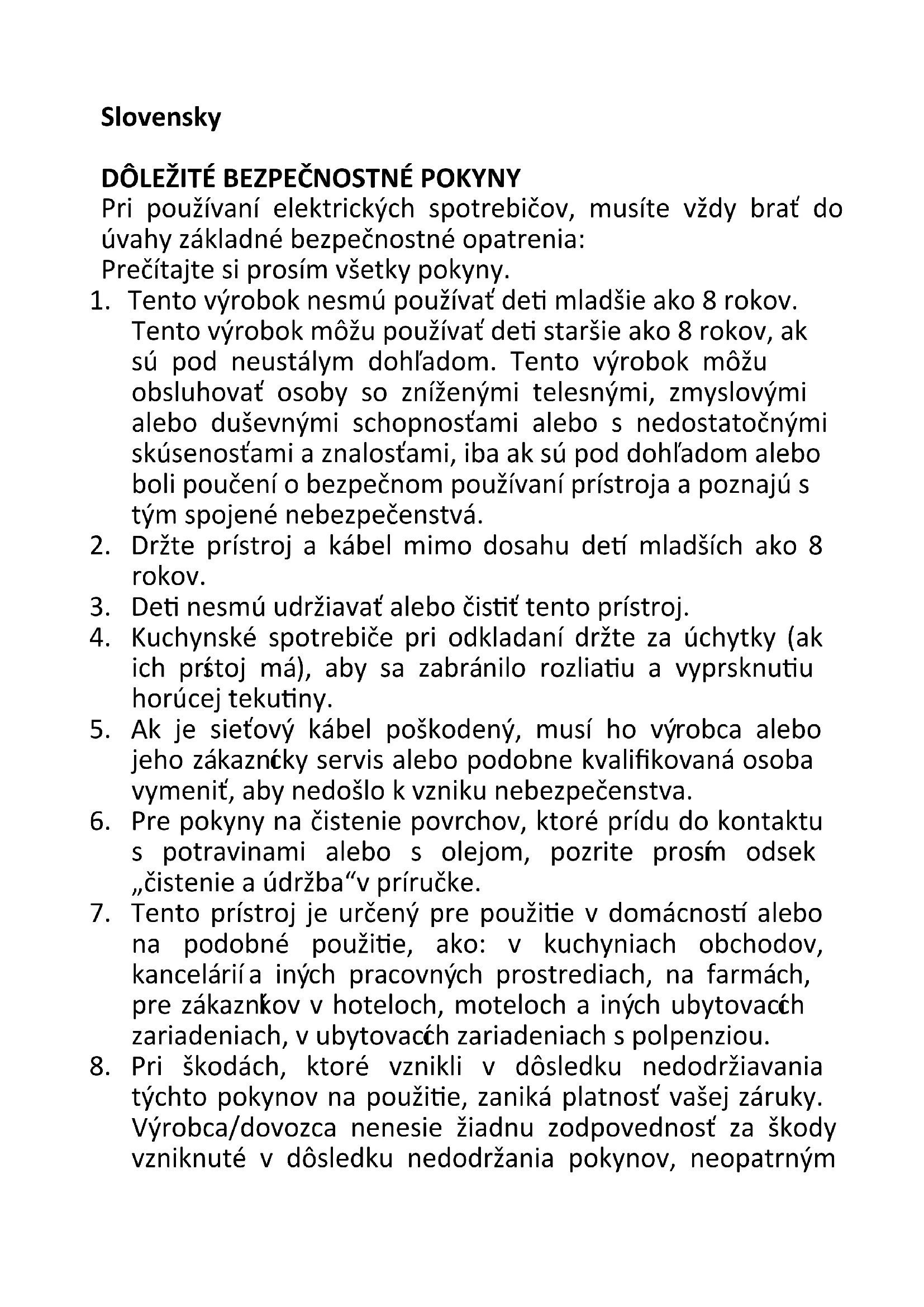 Tento výrobok môžu používať deti staršie ako 8 rokov, ak sú pod neustálym dohľadom. Tento výrobok môžu obsluhovať osoby so zníženými telesnými, zmyslovými alebo duševnými schopnosťami alebo s nedostatočnými skúsenosťami a znalosťami, iba ak sú pod dohľadom alebo boli poučení o bezpečnom používaní prístroja a poznajú s tým spojené nebezpečenstvá.
