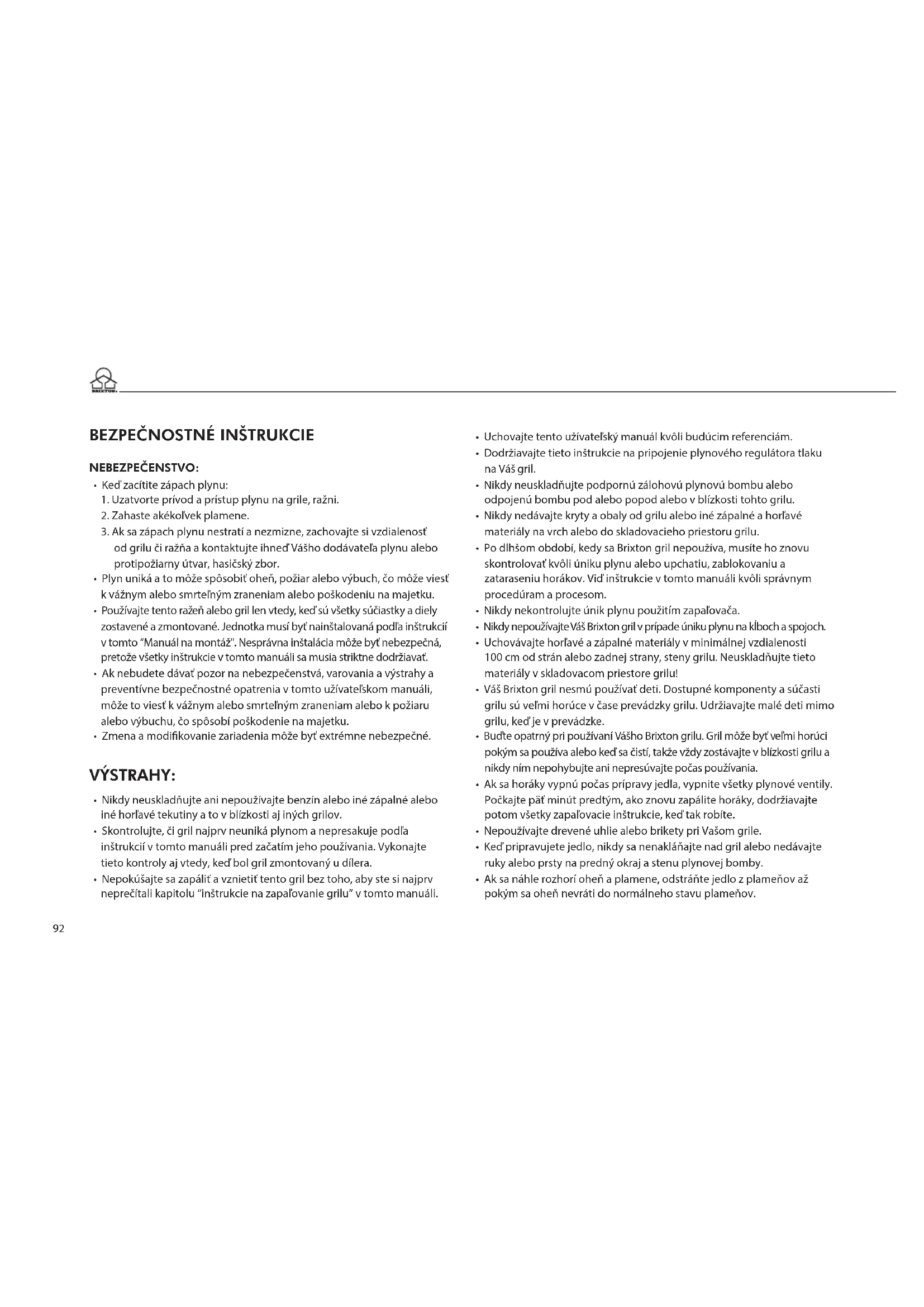 VÝSTRAHA: Váš gril je navrhnutý a vyrobený na používanie s plynom nie iného typu ako toho, ktorý je označený na tipovacom štítku a platničke. Nikdy nepoužívajte Váš gril s inými typmi plynu. Nedbanlivosť a zanedbanie tohto varovania a výstrahy môže viesť k rizikám vzniku požiaru a ohňa a osobným zraneniam. Navyše, anuluje a zruší to záruku a takto sa stáva neplatnou a zaniká. VÝSTRAHA: Nikdy neuskladňujte rezervné plynové bomby pod alebo popod v blízkosti grilu. Nenapĺňajte plynovú bombu nad 80 percent; a v prípade, že táto informácia nebude prísne a striktne dodržiavaná, môže byť výsledkom oheň alebo požiar a to bude viesť k smrteľným alebo vážnym zraneniam. VÝSTRAHA: Uchovávajte elektrické káble a palivové hadice a trubice mimo horúcich povrchov. VÝSTRAHA: Nikdy neumiestňujte Brixton gril pod alebo v blízkosti prístrešku odolnému proti popáleniu alebo striešky proti slnku. VÝSTRAHA: Tento gril nie je určený na inštaláciu alebo výmenu v karavane/obytnom prívese ani nie je určený na inštaláciu na alebo v lodi. VÝSTRAHA: Pre Vašu vlastnú bezpečnosť, nikdy neuskladňujte alebo nepoužívajte benzín alebo iné zápalné a horľavé výbušné výpary a plyny alebo tekutiny v blízkosti tohto alebo iných grilov. Nedodržiavanie tohto varovania a výstrahy má za následok vznik požiaru, ohňa, výbuchu alebo osobným zraneniam.
