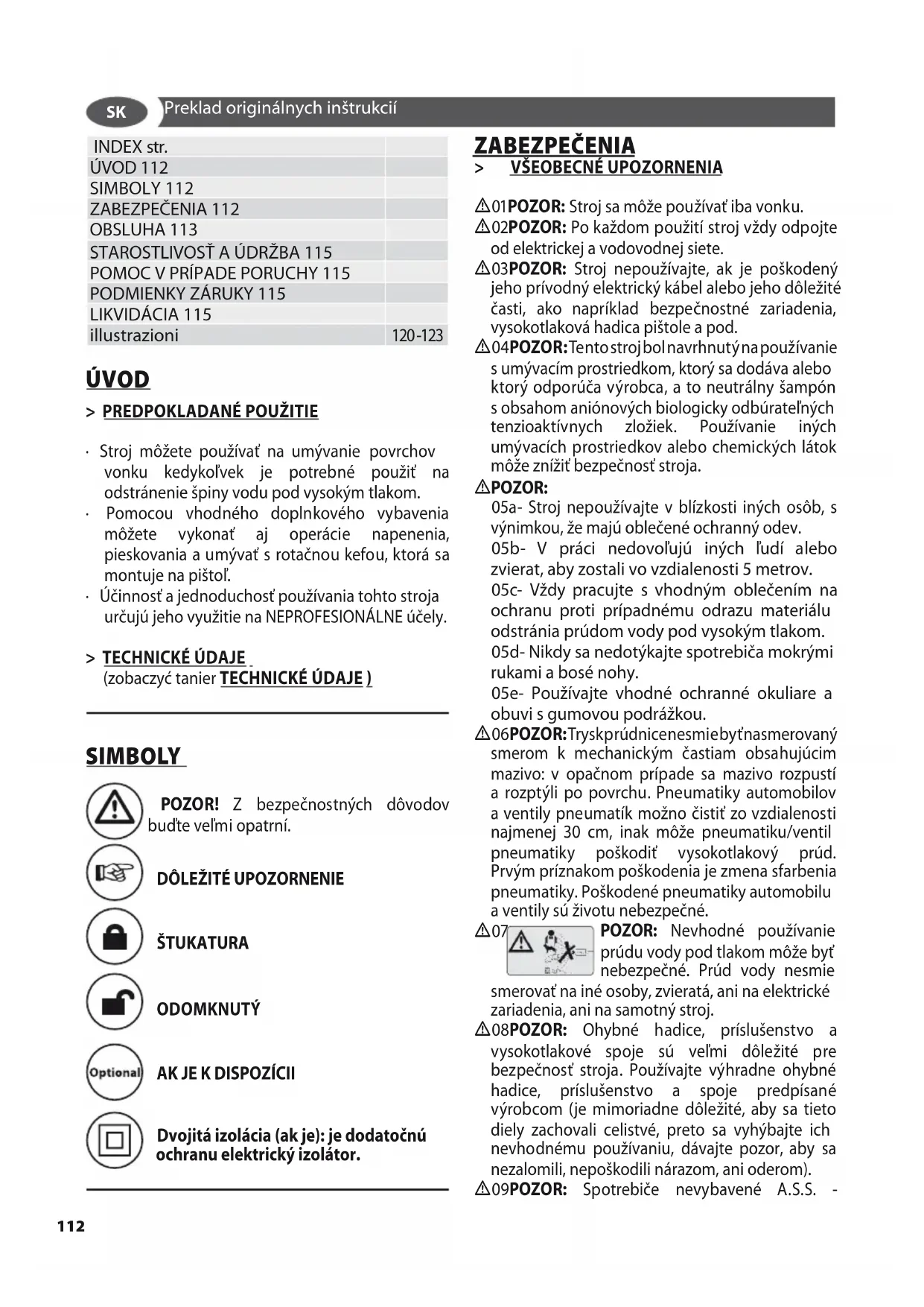 - 0 7 POZOR: Nevhodné používanie prúdu vody pod tlakom môže byť nebezpečné. Prúd vody nesmie smerovať na iné osoby, zvieratá, ani na elektrické zariadenia, ani na samotný stroj.
