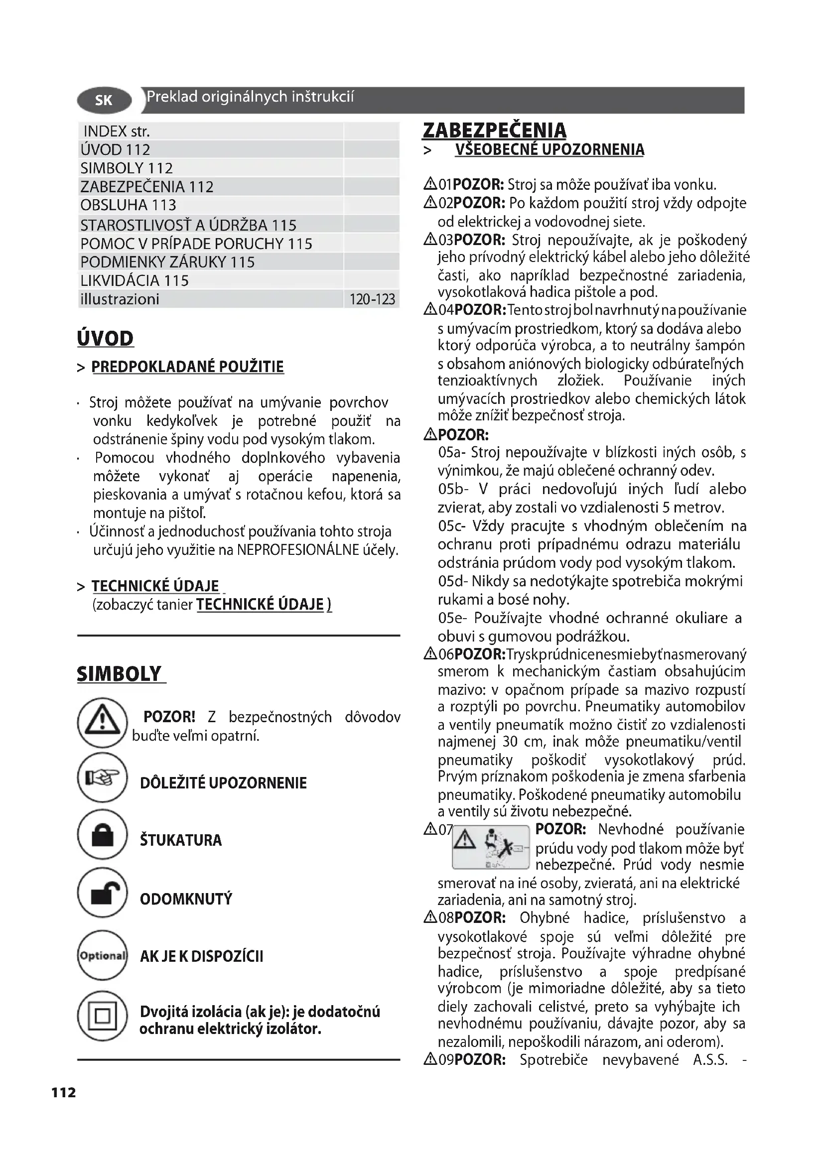 - 0 7 POZOR: Nevhodné používanie prúdu vody pod tlakom môže byť nebezpečné. Prúd vody nesmie smerovať na iné osoby, zvieratá, ani na elektrické zariadenia, ani na samotný stroj.