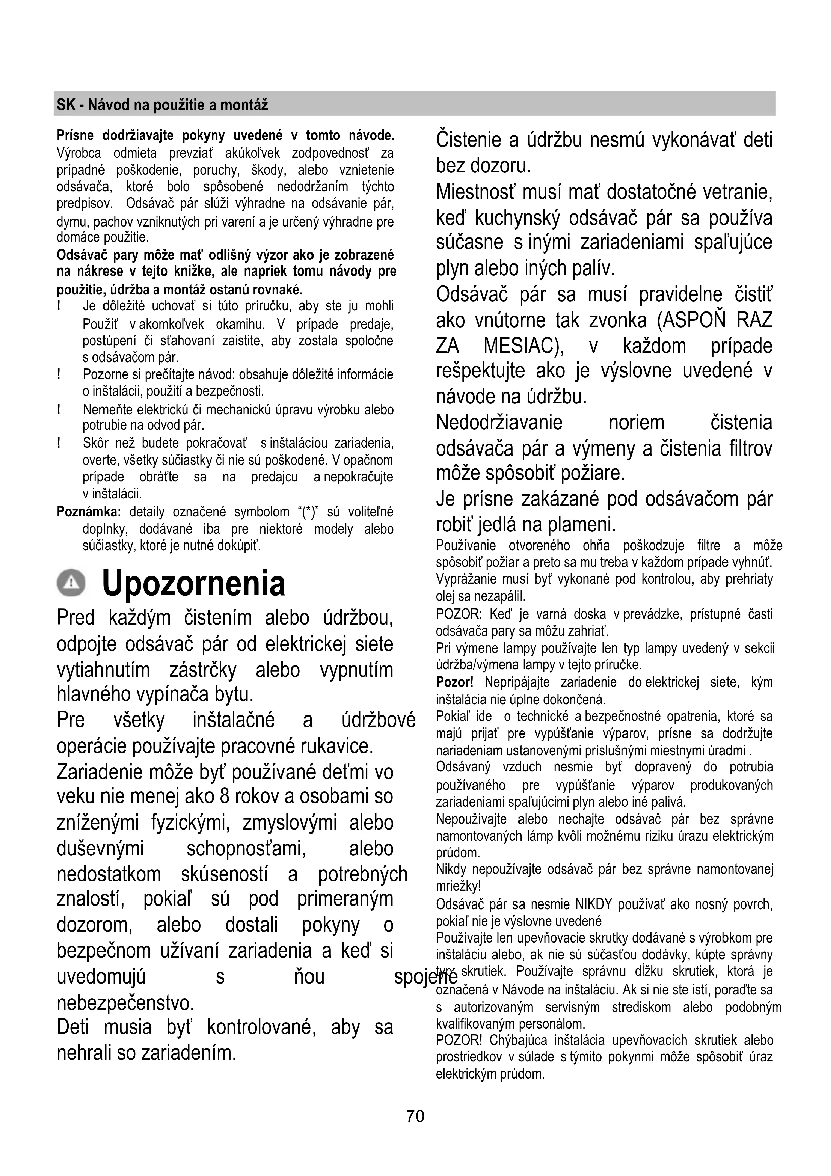 Jestliže osvětlení nefunguje, dříve než zavoláte servis si ověřte, zda jste správně nasadili žárovky do uložení.70 SK - Návod na použitie a montáž Prísne dodržiavajte pokyny uvedené v tomto návode. Výrobca odmieta prevziať akúkoľvek zodpovednosť za prípadné poškodenie, poruchy, škody, alebo vznietenie odsávača, ktoré bolo spôsobené nedodržaním týchto predpisov. Odsávač pár slúži výhradne na odsávanie pár, dymu, pachov vzniknutých pri varení a je určený výhradne pre domáce použitie. Odsávač pary môže mať odlišný výzor ako je zobrazené na nákrese v tejto knižke, ale napriek tomu návody pre použitie, údržba a montáž ostanú rovnaké. ! Je dôležité uchovať si túto príručku, aby ste ju mohli Použiť v akomkoľvek okamihu. V prípade predaje, postúpení či sťahovaní zaistite, aby zostala spoločne s odsávačom pár. ! Pozorne si prečítajte návod: obsahuje dôležité informácie o inštalácii, použití a bezpečnosti. ! Nemeňte elektrickú či mechanickú úpravu výrobku alebo potrubie na odvod pár. ! Skôr než budete pokračovať s inštaláciou zariadenia, overte, všetky súčiastky či nie sú poškodené. V opačnom prípade obráťte sa na predajcu a nepokračujte v inštalácii. Poznámka: detaily označené symbolom “(*)” sú voliteľné doplnky, dodávané iba pre niektoré modely alebo súčiastky, ktoré je nutné dokúpiť. Upozornenia Pred každým čistením alebo údržbou, odpojte odsávač pár od elektrickej siete vytiahnutím zástrčky alebo vypnutím hlavného vypínača bytu. Pre všetky inštalačné a údržbové operácie používajte pracovné rukavice. Zariadenie môže byť používané deťmi vo veku nie menej ako 8 rokov a osobami so zníženými fyzickými, zmyslovými alebo duševnými schopnosťami, alebo nedostatkom skúseností a potrebných znalostí, pokiaľ sú pod primeraným dozorom, alebo dostali pokyny o bezpečnom užívaní zariadenia a keď si uvedomujú s ňou spojené nebezpečenstvo. Deti musia byť kontrolované, aby sa nehrali so zariadením. Čistenie a údržbu nesmú vykonávať deti bez dozoru. Miestnosť musí mať dostatočné vetranie, keď kuchynský odsávač pár sa používa súčasne s inými zariadeniami spaľujúce plyn alebo iných palív. Odsávač pár sa musí pravidelne čistiť ako vnútorne tak zvonka (ASPOŇ RAZ ZA MESIAC), v každom prípade rešpektujte ako je výslovne uvedené v návode na údržbu. Nedodržiavanie noriem čistenia odsávača pár a výmeny a čistenia filtrov môže spôsobiť požiare. Je prísne zakázané pod odsávačom pár robiť jedlá na plameni. Používanie otvoreného ohňa poškodzuje filtre a môže spôsobiť požiar a preto sa mu treba v každom prípade vyhnúť. Vyprážanie musí byť vykonané pod kontrolou, aby prehriaty olej sa nezapálil. POZOR: Keď je varná doska v prevádzke, prístupné časti odsávača pary sa môžu zahriať. Pri výmene lampy používajte len typ lampy uvedený v sekcii údržba/výmena lampy v tejto príručke. Pozor! Nepripájajte zariadenie do elektrickej siete, kým inštalácia nie úplne dokončená. Pokiaľ ide o technické a bezpečnostné opatrenia, ktoré sa majú prijať pre vypúšťanie výparov, prísne sa dodržujte nariadeniam ustanovenými príslušnými miestnymi úradmi . Odsávaný vzduch nesmie byť dopravený do potrubia používaného pre vypúšťanie výparov produkovaných zariadeniami spaľujúcimi plyn alebo iné palivá. Nepoužívajte alebo nechajte odsávač pár bez správne namontovaných lámp kvôli možnému riziku úrazu elektrickým prúdom. Nikdy nepoužívajte odsávač pár bez správne namontovanej mriežky! Odsávač pár sa nesmie NIKDY používať ako nosný povrch, pokiaľ nie je výslovne uvedené Používajte len upevňovacie skrutky dodávané s výrobkom pre inštaláciu alebo, ak nie sú súčasťou dodávky, kúpte správny typ skrutiek. Používajte správnu dĺžku skrutiek, ktorá je označená v Návode na inštaláciu. Ak si nie ste istí, poraďte sa s autorizovaným servisným strediskom alebo podobným kvalifikovaným personálom. POZOR! Chýbajúca inštalácia upevňovacích skrutiek alebo prostriedkov v súlade s týmito pokynmi môže spôsobiť úraz elektrickým prúdom.71 Tento spotrebič je označený v súlade s európskou smernicou 2012/19/EC o likvidácii elektrického a elektronického zariadenia (WEEE). Uistením sa, že tento výrobok bol po svojej životnosti odstránený správnym spôsobom, užívateľ prispieva k predchádzaniu možným negatívnym následkom pre životné prostredie a zdravie. Symbol výrobku alebo na jeho sprievodnej dokumentácii, upozorňuje, že s týmto výrobkom sa nesmie zaobchádzať ako s domácim odpadom, ale musí byť odovzdaný do príslušné miesta zberu pre recykláciu elektrických a elektronických prístrojov. Zbaviť sa ho riadením sa podľa miestnych zákonov o odstránení odpadkov. Kvôli dokonalejším informáciám o zaobchádzaní, znovuzískaní a recyklácii tohto výrobku, kontaktujte príslušné miestne úrady, služby pre zber domáceho odpadu alebo predajňu , v ktorej výrobok bol zakúpený. Prístroj bol navrhnutý, testovaný a vyrobený v súlade s: