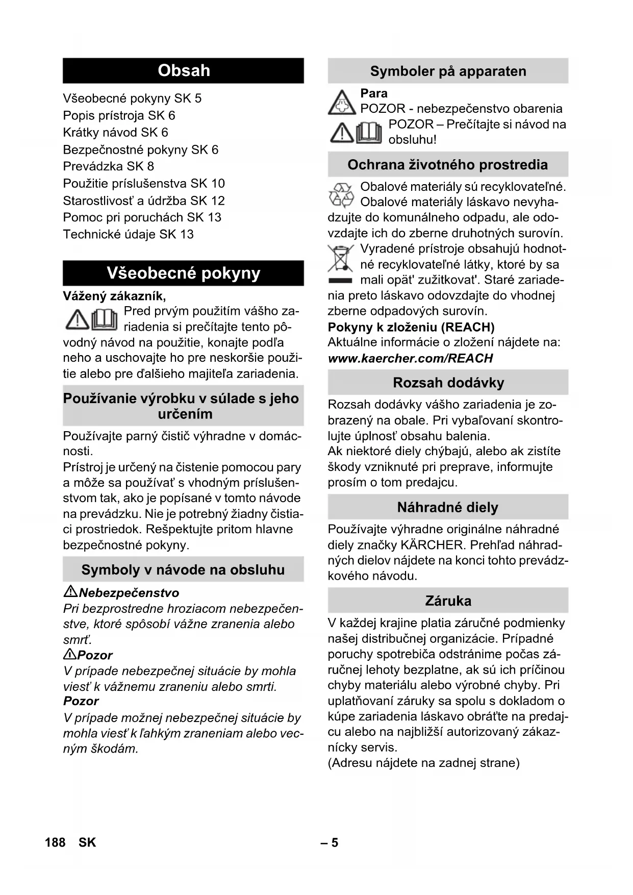 Spoj sieťovej zástrčky a predlžovacieho kábla nesmie ležať vo vode. Pri výmene spojok na sieťovom alebo predlžovacom kábli musí ostať zacho- vaná ochrana pred postriekaním vodou a mechanická pevnosť. Používateľ je povinný používať zariade- nie v súlade s jeho určením. Je povinný prihliadať na miestne podmienky a pri práci so zariadením dávať pozor aj na osoby vo svojom okolí. Tento prístroj môžu používať deti od 8 rokov a osoby s obmedzenými fyzický- mi, senzorickými alebo duševnými schopnosťami, ak sú pod dozorom, ale- bo ak boli zaškolené na bezpečné pou- žívanie prístroja a s ním spojenými nebezpečenstvami. Deti sa nesmú hrať s prístrojom. Deti nemôžu vykonávať čistenie a užívateľskú údržbu bez doh- ľadu dospelej osoby. Zariadenie sa nesmie nikdy ponechá- vať bez dozoru, ak je v činnosti. Pozor pri čistení stien s obkladmi so zá- suvkami. Pozor Dbajte, aby sa prívodný alebo predlžo- vací kábel neznehodnotil prejazdom, roztlačením, aby sa nevytrhol ani inak nepoškodil. Sieťové káble chráňte pred vysokými teplotami, olejmi a ostrými hranami. Do vodnej nádrže nikdy nedávajte roz- púšťadlá, tekutiny s obsahom rozpúšťa- diel alebo nezriedené kyseliny (napl. čistiace prostriedky, benzín, riedidlo a acetón), pretože tieto poškodzujú mate- riál zariadenia. Zariadenie musí mať stabilný podklad. Prístroj prevádzkujte alebo skladujte len pod ľa popisu resp. obrázku! Parná páka sa pri prevádzke nesmie zaseknúť. Zariadenie chráňte pred dažďom. Nes- kladujte ho vo vonkajších priestoroch. Pozor Bezpečnostné prvky slúžia na ochranu po- užívateľa pred poranením a nesmú byť zmenené ani vyradené z činnosti. Odporúčame vám pred použitím parného čističa pozametať alebo povysávať podla- hu. Tak sa zbaví podlaha už pred vlhkým čistením nečistoty/voľných častíc. Regulátor tlaku udržiavia počas prevádzky podľa možnosti konštantný tlak v kotle. Ohrev sa pri dosiahnutí maximálneho pre- vádzkového tlaku v kotle vypne a pri pokle- se tlaku v kotle v dôsledku odberu pary sa opät' zapne. Ak regulátor tlaku vypadne, termostat kotla pri vzniku chyby vypne a prístroj sa prehre- je, potom vypne bezpečnostný termostat prístroj. Za účelom spätného prestavenia bezpečnostného termostatu sa obráťte na príslušný zákaznícky servis firmy KÄR- CHER. Bezpečnostné prvky Čistenie podlahy Regulátor tlaku Bezpečnostný termostat 190 SK– 8 Bezpečnostný uzáver uzatvára kotol proti vznikajúcemu tlaku pary. Pokiaľ by bol re- gulátor tlaku chybný a v kotle by vznikol pretlak, v bezpečnostnom uzávere sa otvo- rí pretlakový ventil a para bude vystupovat' cez uzáver do voľného priestranstva. Za účelom opätovného uvedenia prístroja do prevádzky sa obrát'te na príslušný zá- kaznícky servis firmy KÄRCHER. Obrázky nájdete na vyklá- pajúcej sa strane! Obrázok Nasuňte a zaistite zaklapnutím vodiacu kladku a prepravné kolieska. Otvorte kryt zásuvky prístroja. Parnú zástrčku zasuňte pevne do zá- suvky na prístroji. Pritom musí byť po- čuť zástrčku, ako zapadla na svoje miesto. Pre rozdelenie: kryt prístrojovej zásuv- ky stlačte smerom nadol a parnú zástr- čku vytiahnite z prístrojovej zásuvky. Obrázok + Potrebné príslušenstvo (viď kapitola „Použitie príslušenstva“) spojte s par- nou pištoľou. Za týmto účelom nasuňte otvorený koniec príslušenstva na parnú pištoľ a nasuňte ho na parnú pištoľ tak hlboko, až kým odblokovacie tlačidlo parnej pištole nezaskočí do západky. Obrázok V prípade potreby používajte predlžo- vaciu rúrku. Za týmto účelom namontuj- te jednu resp. obidve predlžovacie rúrky na parnú pištoľ. Potrebné príslušenstvo nasuňte na voľný koniec predlžovacej rúrky. Nebezpečenstvo Pri odpojovaní častí príslušenstva môže odkvapkávať horúca voda! Časti príslušen- stva nikdy nerozpájajte počas prúdenia pary - nebezpečenstvo obarenia! Prepínač množstva pary posuňte sme- rom dozadu (parná páka zablokovaná). Obrázok Ak chcete odpojiť časti príslušenstva, stlačte uvoľňovacie tlačidlo a diely od- tiahnite od seba. Upozornenie: Ak budete stále používat' bežne predajnú destilovanú vodu, nie je potrebné odvápňovat' kotol. Pozor Nepoužívajte kondenzovanú vodu zo su- šičky na prádlo! Nenapĺňajte žiadnym čistiacim prostried- kom alebo inými prísadami! Zo zariadenia vyskrutkujte bezpečnost- ný uzáver. Vodu z kotla úplne vypustite (viď obrá- zok ). Do kotla naplňte maximálne 1 litra čerstvej vody z vodovodu. Upozornenie: Teplá voda skracuje čas ohrevu. Bezpečnostný uzáver opäť pevne na- skrutkujte na zariadenie. Postavte prístroj na pevný podklad. Pozor Zariadenie sa nesmie počas čistenia nosiť. Siet'ovú zástrčku zasuňte do zásuvky. Stlačte vypínač - Zap, aby ste zapli prí- stroj. Obidve kontrolky musia svietiť. Pozor Zariadenie zapínajte len, ak sa v kotle na- chádza voda. Zariadenie by sa inak mohlo prehriať (viď Pomoc pri poruchách). Po asi 8 minútach zhasne oranžová kontrolka - ohrev. Parný čistič je pripravený na použitie. Bezpečnostný uzáver Prevádzka Montáž príslušenstva Rozoberanie príslušenstva Naplnenie vody Zapnutie prístroja 191SK– 9 Pomocou prepínača pre množstvo pary sa reguluje vystupujúce množstvo pary. Prepí- nač má tri polohy: Prepínač nastavte na požadované množstvo pary. Zatlačte parnú páku, pritom parnú pištoľ najprv vždy nasmerujte na handru, až pokiaľ nebude para vystupovať rovno- merne. Upozornenie: Ohrev parného čističa sa počas používania vždy zapne, aby bol v kotle udržovaný tlak. Pritom svieti oranžová kontrolka - ohrev. Doplnenie vody v kotli je potrebné, ak je pri práci menšie množstvo pary a na záver už nevystupuje žiadna para. Upozornenie: Bezpečnostný uzáver sa