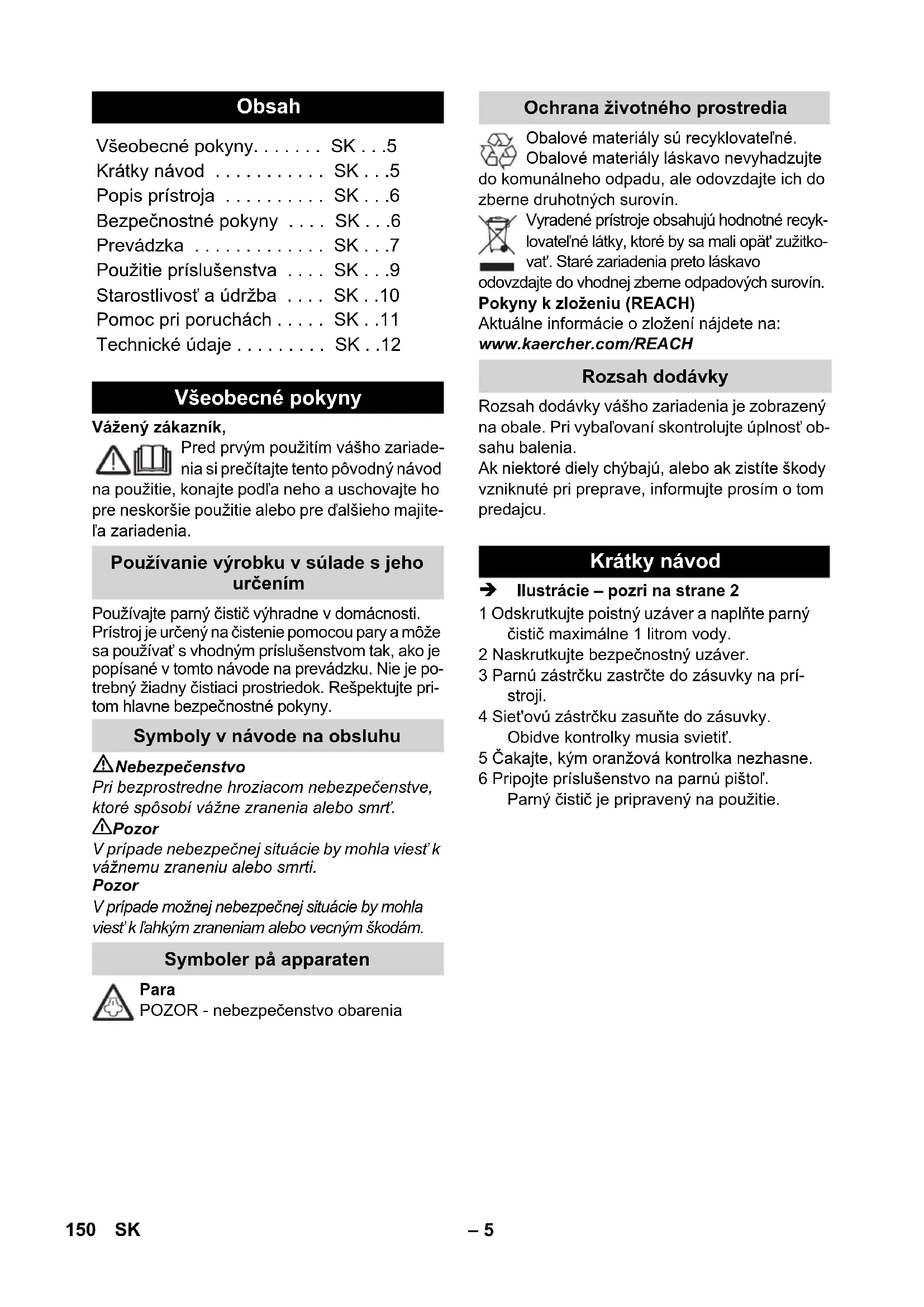 - SK Všeobecné pokyny Používanie výrobku v súlade s jeho určením Symboly v návode na obsluhu Symboler på apparaten Ochrana životného prostredia Rozsah dodávky Krátky návod 150 SK– 6 V tomto návode na prevádzku je popísaná maxi- málna výbava. Podľa modelu existujú rozdiely v rozsahu dodávky (pozri obal). Obrázky nájdete na vyklápajú- cej sa strane! Nebezpečenstvo Používanie v priestoroch so zvýšením nebez- pečenstvom výbuchu je zakázané. Pri používaní zariadenia v nebezpečnom pro- stredí je potrebné dodržiavať príslušné bez- pečnostné predpisy. Zariadenie sa nesmie používať v plaveckých bazénoch, ktoré sú napustené vodou. Zariadenie sa nesmie používať na čistenie elektrických prístrojov napr. pece, odsávače, mikrovlné rúry, televízne prijímače, lampy, su- šiče, elektrické kúrenia atď. Pred použitím skontrolujte stav zariadenia a príslušenstva. Pokiaľ nie je stav v poriadku, ne- smie sa používať. Skontrolujte prosím najmä sieťový kábel, bezpečnostný uzáver a parnú hadicu. Poškodený prívodný kábel dajte bezodkladne vymeniť autorizovanej servisnej službe alebo kvalifikovanému elektrotechnikovi. Poškodenú parnú hadicu neodkladne vymeň- te. Používať sa smie iba parná hadica odporú- čaná výrobcom (objednávacie číslo viď Zoznam náhradných dielov). Nikdy sa nedotýkajte sieťovej zásuvky a vidlice vlhkými rukami. Nenaparujte predmety, ktoré obsahujú zdraviu škodlivé látky (napr. azbest). Prúdu pary sa nedotýkajte z blízkej vzdiale- nosti rukou alebo ho nikdy nesmerujte na ľudí alebo zvieratá (nebezpečenstvo obarenia). 몇 Pozor Zariadenie môže byť pripojené iba k elektrickej prípojke, ktorá bola vyhotovená elektroinštalaté- rom podľa požiadaviek normy IEC 60364. Zariadenie pripájajte iba na striedavý prúd. Napätie musí zodpovedať údajom na typo- vom štítku zariadenia. Vo vlhkých miestnostiach, napr. v kúpeľni, zapájajte zariadenie do zástrčky s predrade- ným ochranným spínačom FI. Nevhodné predlžovacie vedenia môžu byť nebezpečné. Používajte iba kábel chránený pred postriekaním vodou s minimálnym prie- merom 3x1 mm p. 12