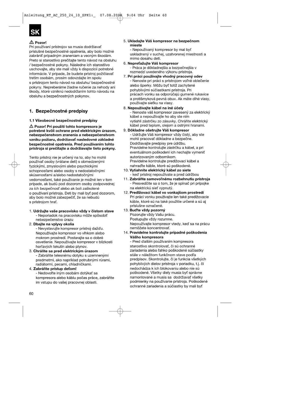 Vášho kompresora - Pred ďalším používaním kompresora starostlivo skontrolovať, či sú ochranné zariadenia alebo ľahko poškodené súčiastky stále v náležitom funkčnom stave podľa predpisov. Skontrolujte, či je funkcia všetkých pohyblivých dielov prístroja v poriadku, t.j. či nedochádza k ich blokovaniu alebo nie sú poškodené. Všetky diely musia byť správne namontované a musia sa dodržiavať všetky podmienky na používanie prístroja. Poškodené ochranné zariadenia a súčiastky by mali byť Anleitung_RT_AC_250_24_10_SPK1:_ 07.08.2008 9:04 Uhr Seite 60SK