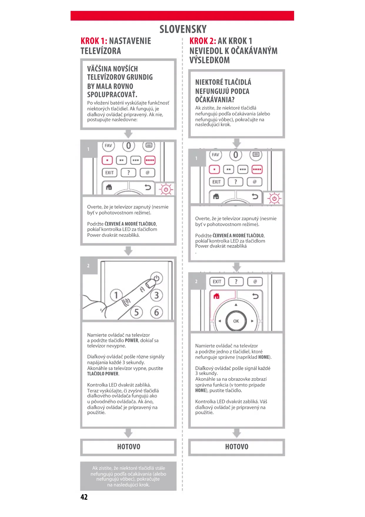 OČAKÁVANIA? Ak zistíte, že niektoré tlačidlá nefungujú podľa očakávania (alebo nefungujú vôbec), pokračujte na nasledujúci krok. Overte, že je televízor zapnutý (nesmie byť v pohotovostnom režime). Podržte ČERVENÉ AMODRÉ TLAČIDLO, pokiaľ kontrolka LED za tlačidlom Power dvakrát nezabliká
