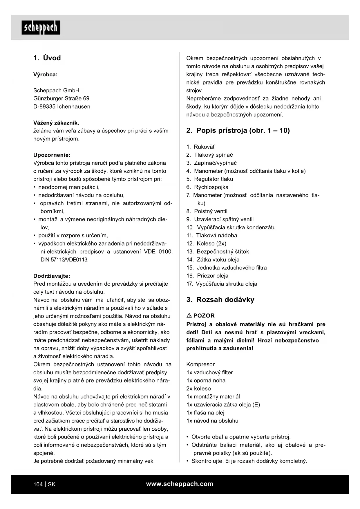 Výrobca: Scheppach GmbH Günzburger Straße 69 D-89335 Ichenhausen Vážený zákazník, želáme vám veľa zábavy a úspechov pri práci s vaším novým prístrojom. Upozornenie: Výrobca tohto prístroja neručí podľa platného zákona o ručení za výrobok za škody, ktoré vzniknú na tomto prístroji alebo budú spôsobené týmto prístrojom pri: