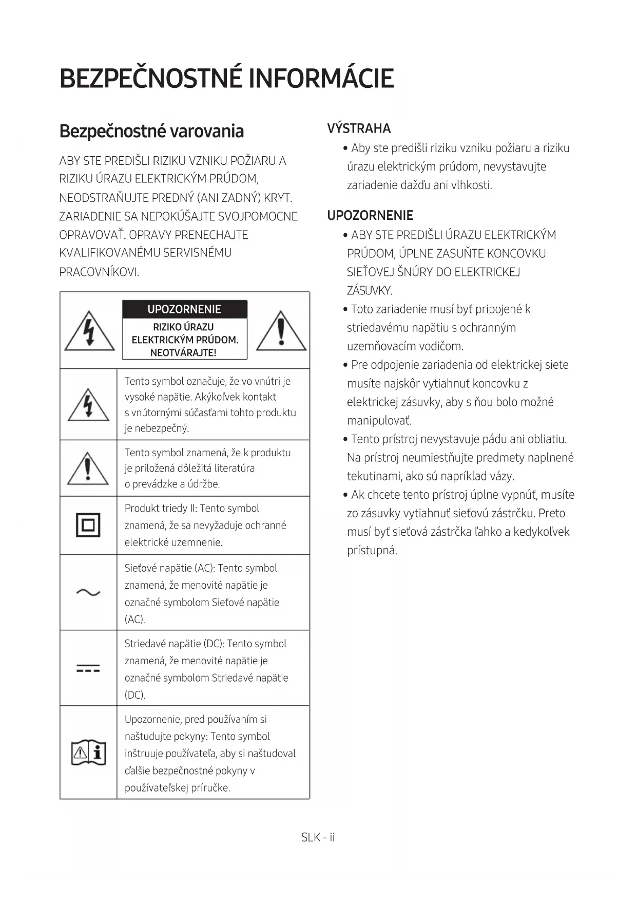 - Ak chcete tento prístroj úplne vypnúť, musíte zo zásuvky vytiahnuť sieťovú zástrčku. Preto musí byť sieťová zástrčka ľahko a kedykoľvek prístupná.SLK - iii BEZPEČNOSTNÉ OPATRENIA