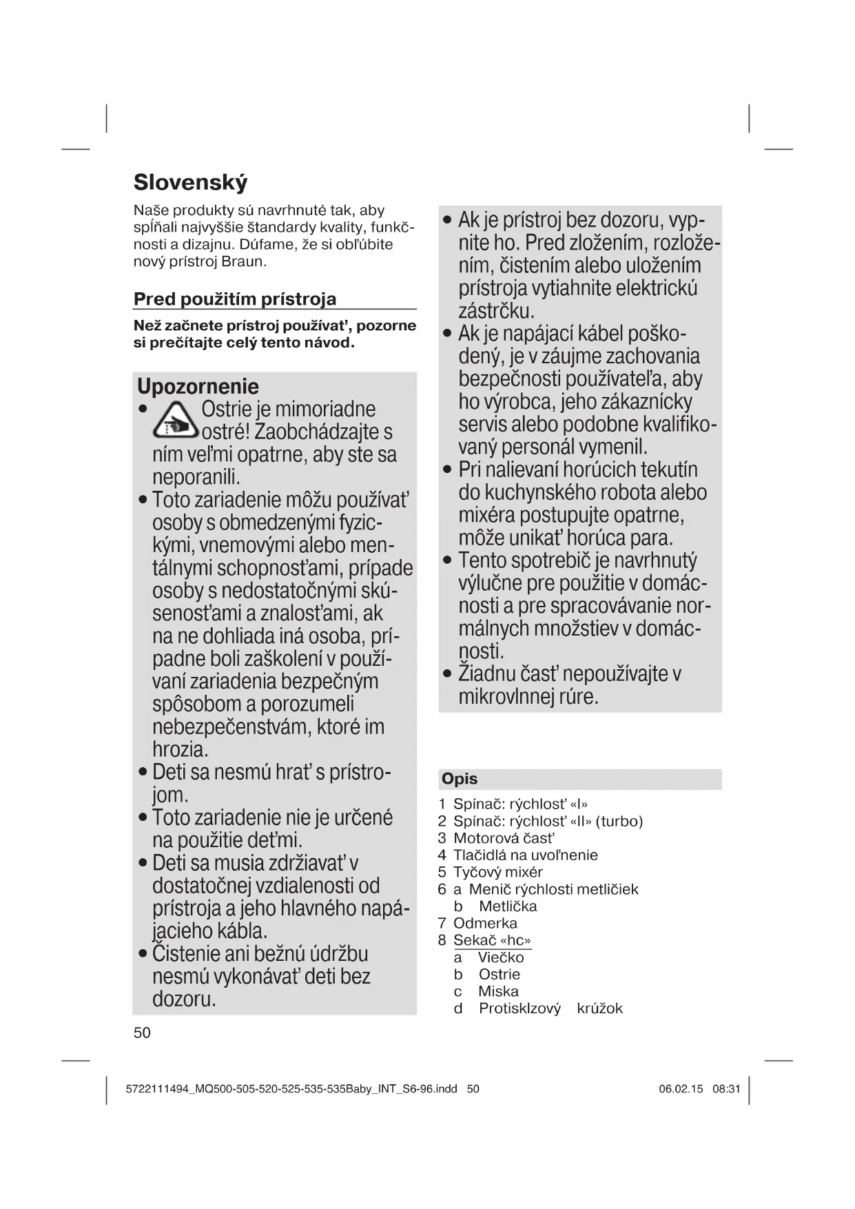 Žiadnu časť nepoužívajte v mikrovlnnej rúre. Opis 1 Spínač: rýchlosť «I» 2 Spínač: rýchlosť «II» (turbo) 3 Motorová časť 4 Tlačidlá na uvoľnenie 5 Tyčový mixér 6 a Menič rýchlosti metličiek b Metlička 7 Odmerka 8 Sekač «hc» a Viečko b Ostrie c Miska d Protisklzový krúžok Slovenský 5722111494_MQ500-505-520-525-535-535Baby_INT_S6-96.indd 505722111494_MQ500-505-520-525-535-535Baby_INT_S6-96.indd 50 06.02.15 08:3106.02.15 08:3151 9 Sekač «ca» a Viečko (s meničom rýchlosti) b Ostrie c Miska d Protisklzový krúžok Pred prvým použitím všetky diely očistite – pozri kapitolu «Čistenie». Spôsob použitia prístroja Ručný mixér (pozri obrázok A) Ručný mixér sa dokonale hodí na prípravu dipov, omáčok, polievok, majonézy a detskej stravy, ako aj na miešanie nápojov, ovocných alebo mliečnych koktailov.