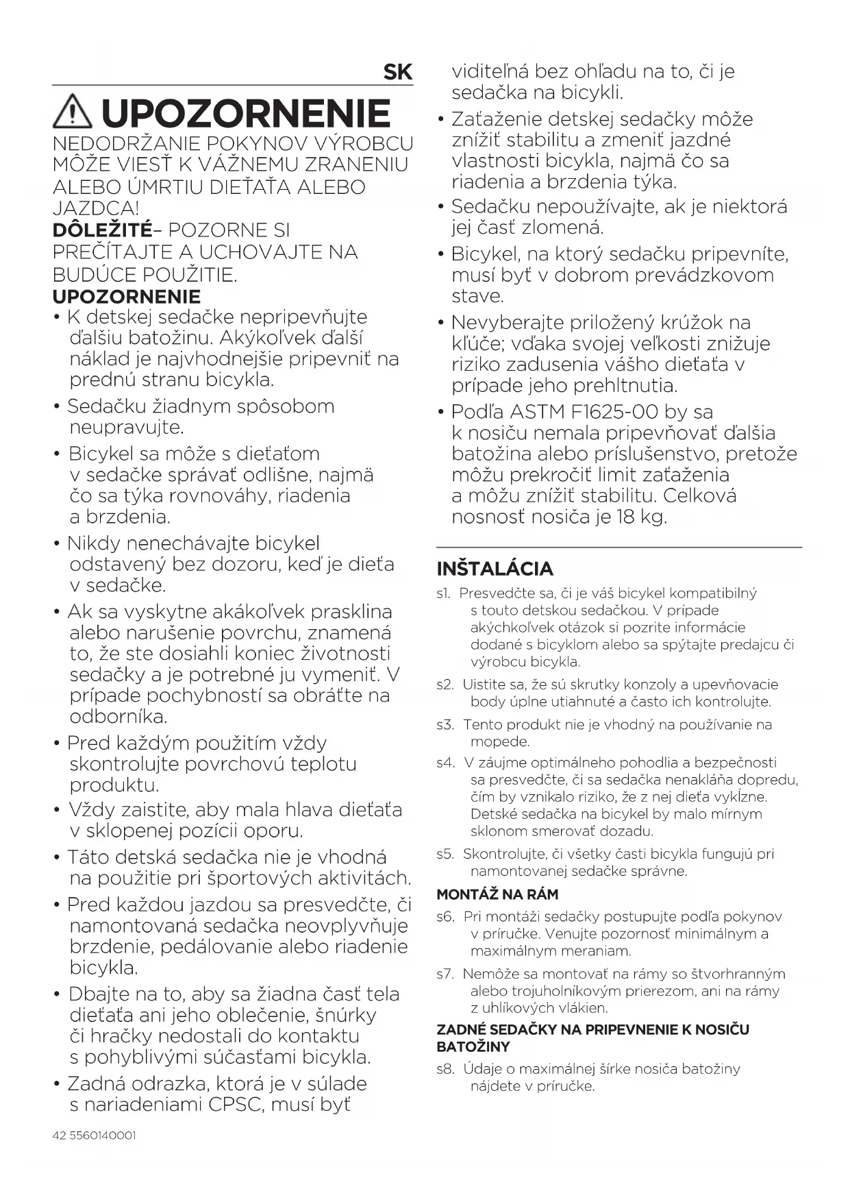 s1. Presvedčte sa, či je váš bicykel kompatibilný stouto detskou sedačkou. Vprípade akýchkoľvek otázok si pozrite informácie dodané sbicyklom alebo sa spýtajte predajcu či výrobcu bicykla. s2. Uistite sa, že sú skrutky konzoly a upevňovacie body úplne utiahnuté a často ich kontrolujte. s3. Tento produkt nie je vhodný na používanie na mopede. s4. V záujme optimálneho pohodlia abezpečnosti sa presvedčte, či sa sedačka nenakláňa dopredu, čím by vznikalo riziko, že znej dieťa vykĺzne. Detské sedačka na bicykel by malo mírnym sklonom smerovať dozadu. s5. Skontrolujte, či všetky časti bicykla fungujú pri namontovanej sedačke správne.