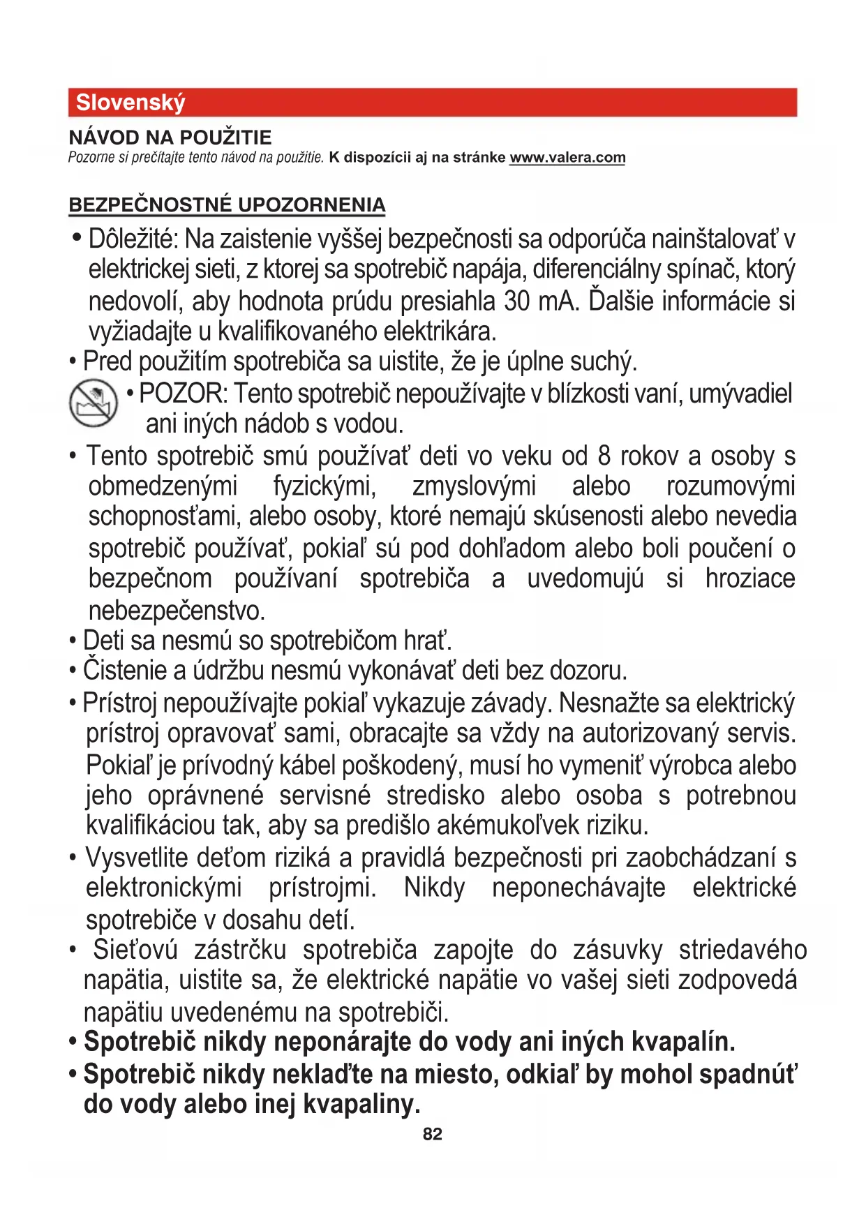 prevedená neautorizovaným servisom. V prípade zistenia závady vráťte zabalený prístroj spoločne so záručným listom s riadne uvedeným dátumom a pečiatkou servisnému centru značky Valera alebo predajcovi, ktorý ho zašle na servisné centrum oficiálneho dovozca.