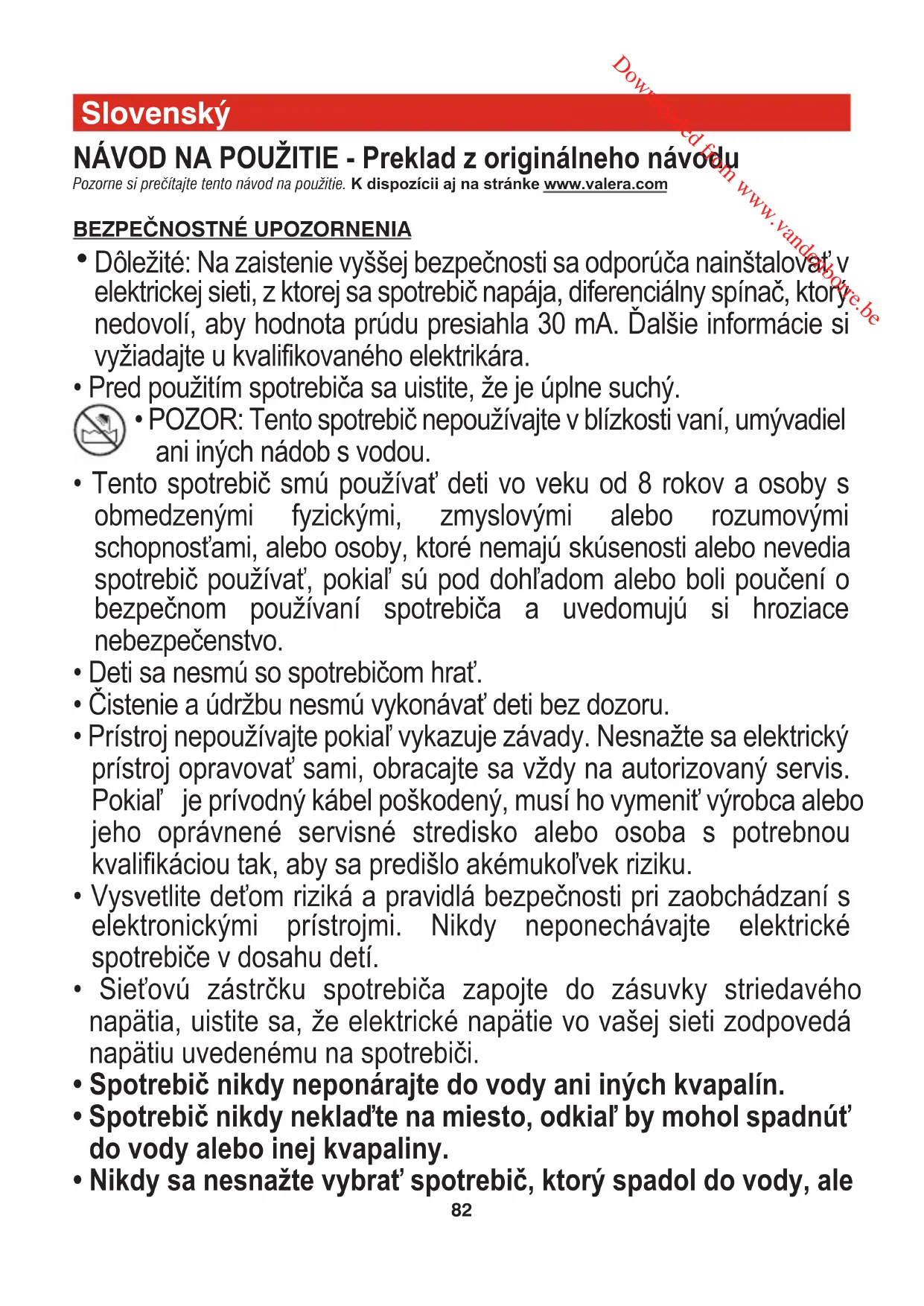 Preklad: PRENOSNÝ SUŠIČ VLASOV NA PROFESIONÁLNE POUŽITIE Downloaded from www.vandenborre.be84 vlasov, efekt strapatých vlasov a nežiadúceho skučeravenia vlasov. ČISTIACI EFEKT Negatívne nabité ionty emitované sušičom na vlasy zaisťujú, že čiastočky znečisteného vzduchu sú k sebe priťahované, stávajú sa tak ťažšími a samovoľne padajú dole silou gravitácie, a tak prečisťujú ovzdušie. Okrem toho, po každom použití sušiča na vlasy zaznamenáte príjemnou vôňu: to je ozón, ktorý odstraňuje a ponecháva pocit práve umytých vlasov. Negatívne nabité ionty taktiež elimunujú tabakový dym a ďalšie okolné zápachy. Záruka Záručné podmienky značky VALERA: