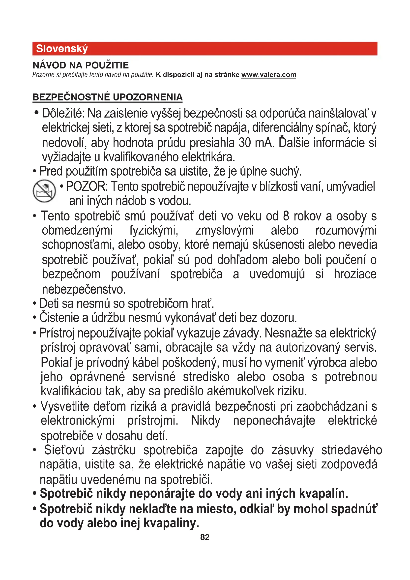 - POZOR: Tento spotrebič nepoužívajte v blízkosti vaní, umývadiel ani iných nádob s vodou.