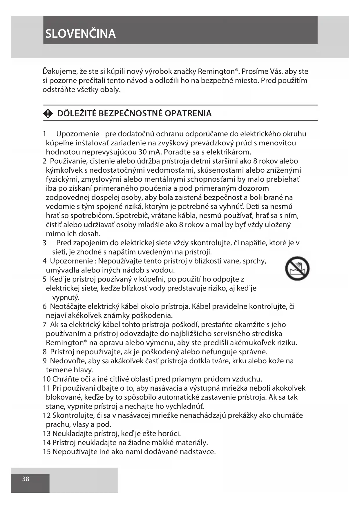 7 Ak sa elektricky kabel tohto pristroja poskodi, prestahte okamzite s jeho použivanim a pristroj odovzdajte do najblizsieho servisného strediska Remington® na opravu alebo výmenu, aby ste predisci akémukol'vek riziku.