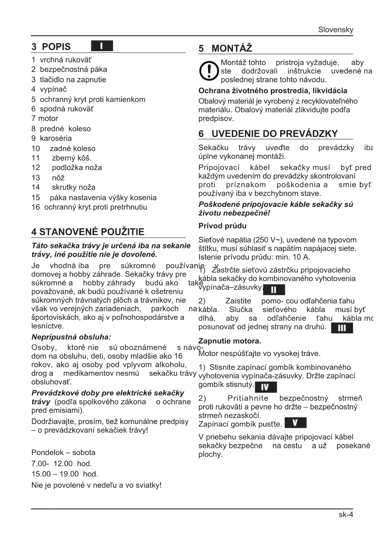 Táto sekačka trávy je určená iba na sekanie trávy, iné použitie nie je dovolené. Je vhodnáiba pre súkromné používanie v domovejahobbyzáhrade.Sekačkytrávypre súkromnéa hobbyzáhrady budúako také považované,akbudúpoužívanékošetreniu súkromnýchtrávnatýchplôchatrávnikov,nie všakvoverejnýchzariadeniach, parkoch na športoviskách,akoajvpoľnohospodárstvea lesníctve. Neprípustná obsluha: Osoby, ktorénie súoboznámené snávo- domnaobsluhu,deti,osobymladšieako16 rokov, ako aj osoby pod vplyvom alkoholu, droga medikamentovnesmú sekačkutrávy obsluhovať. Prevádzkové doby pre elektrické sekačky trávy (podľaspolkovéhozákona oochrane predemisiami). Dodržiavajte,prosím,tiežkomunálnepredpisy –oprevádzkovanísekačiektrávy! Pondelok – sobota 7.00-12.00hod. 15.00–19.00hod. Niejepovolenévnedeľuavosviatky! 5 MONTÁŽ Montážtohto prístrojavyžaduje, aby ste dodržovali inštrukcie uvedenéna poslednej strane tohto návodu. Ochrana životného prostredia, likvidácia Obalovýmateriáljevyrobenýzrecyklovateľného materiálu.Obalovýmateriálzlikvidujtepodľa predpisov.
