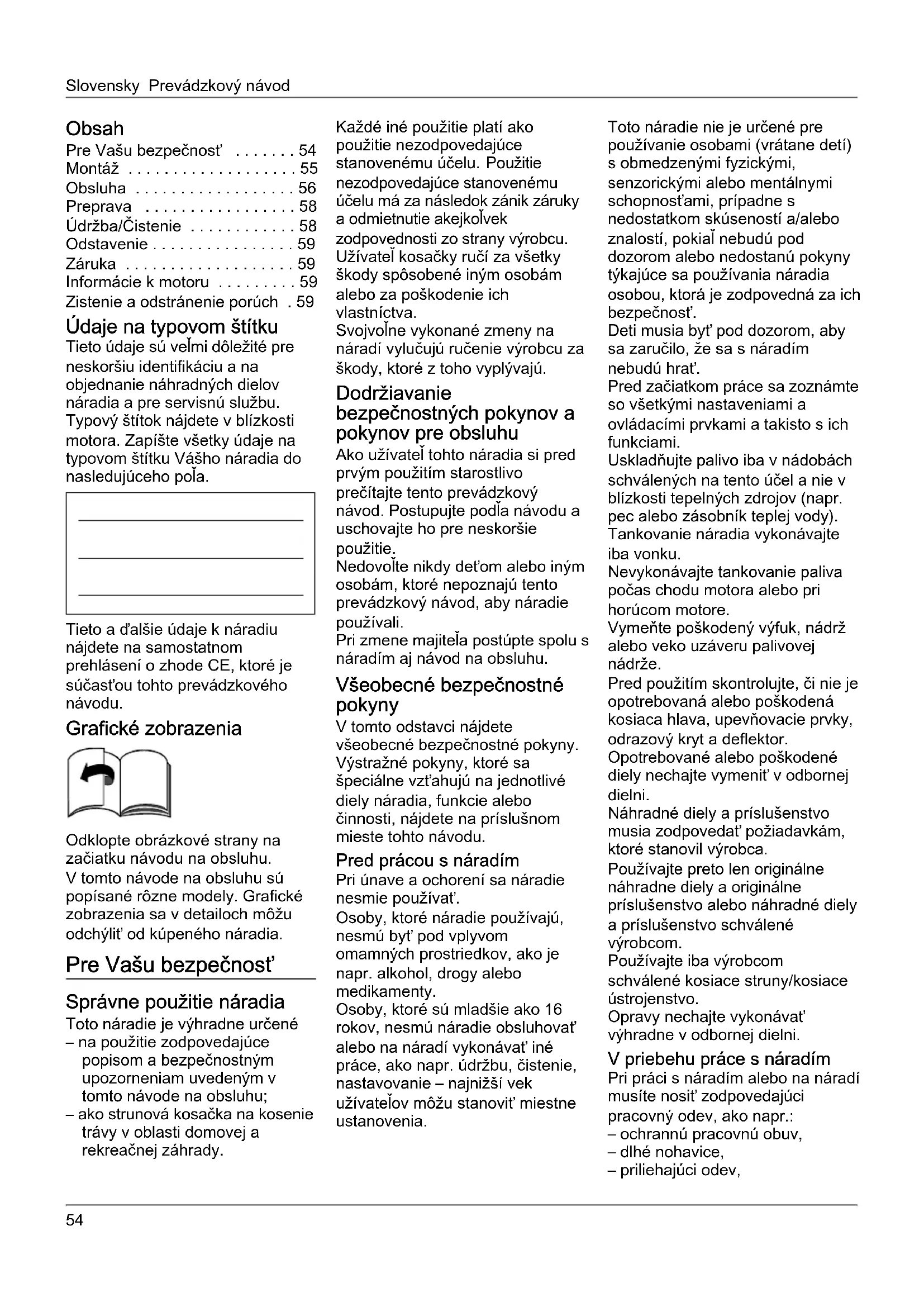 - Informácie k motoru Zistenie a odstránenie porúch . 59 Údaje na typovom štítku Tieto údaje sú veľmi dôležité pre neskoršiu identifikáciu a na objednanie náhradných dielov náradia a pre servisnú službu. Typový štítok nájdete v blízkosti motora. Zapíšte všetky údaje na typovom štítku Vášho náradia do nasledujúceho poľa. Tieto a ďalšie údaje k náradiu nájdete na samostatnom prehlásení o zhode CE, ktoré je súčasťou tohto prevádzkového návodu. Grafické zobrazenia Odklopte obrázkové strany na začiatku návodu na obsluhu. V tomto návode na obsluhu sú popísané rôzne modely. Grafické zobrazenia sa v detailoch môžu odchýliť od kúpeného náradia. Pre Vašu bezpečnosť Správne použitie náradia Toto náradie je výhradne určené – na použitie zodpovedajúce popisom a bezpečnostným upozorneniam uvedeným v tomto návode na obsluhu; – ako strunová kosačka na kosenie trávy v oblasti domovej a rekreačnej záhrady. Každé iné použitie platí ako použitie nezodpovedajúce stanovenému účelu. Použitie nezodpovedajúce stanovenému účelu má za následok zánik záruky a odmietnutie akejkoľvek zodpovednosti zo strany výrobcu. Užívateľ kosačky ručí za všetky škody spôsobené iným osobám alebo za poškodenie ich vlastníctva. Svojvoľne vykonané zmeny na náradí vylučujú ručenie výrobcu za škody, ktoré z toho vyplývajú. Dodržiavanie bezpečnostných pokynov a pokynov pre obsluhu Ako užívateľ tohto náradia si pred prvým použitím starostlivo prečítajte tento prevádzkový návod. Postupujte podľa návodu a uschovajte ho pre neskoršie použitie. Nedovoľte nikdy deťom alebo iným osobám, ktoré nepoznajú tento prevádzkový návod, aby náradie používali. Pri zmene majiteľa postúpte spolu s náradím aj návod na obsluhu. Všeobecné bezpečnostné pokyny V tomto odstavci nájdete všeobecné bezpečnostné pokyny. Výstražné pokyny, ktoré sa špeciálne vzťahujú na jednotlivé diely náradia, funkcie alebo činnosti, nájdete na príslušnom mieste tohto návodu. Pred prácou s náradím Pri únave a ochorení sa náradie nesmie používať. Osoby, ktoré náradie používajú, nesmú byť pod vplyvom omamných prostriedkov, ako je napr. alkohol, drogy alebo medikamenty. Osoby, ktoré sú mladšie ako 16 rokov, nesmú náradie obsluhovať alebo na náradí vykonávať iné práce, ako napr. údržbu, čistenie, nastavovanie – najnižší vek užívateľov môžu stanoviť miestne ustanovenia. Toto náradie nie je určené pre používanie osobami (vrátane detí) s obmedzenými fyzickými, senzorickými alebo mentálnymi schopnosťami, prípadne s nedostatkom skúseností a/alebo znalostí, pokiaľ nebudú pod dozorom alebo nedostanú pokyny týkajúce sa používania náradia osobou, ktorá je zodpovedná za ich bezpečnosť. Deti musia byť pod dozorom, aby sa zaručilo, že sa s náradím nebudú hrať. Pred začiatkom práce sa zoznámte so všetkými nastaveniami a ovládacími prvkami a takisto s ich funkciami. Uskladňujte palivo iba v nádobách schválených na tento účel a nie v blízkosti tepelných zdrojov (napr. pec alebo zásobník teplej vody). Tankovanie náradia vykonávajte iba vonku. Nevykonávajte tankovanie paliva počas chodu motora alebo pri horúcom motore. Vymeňte poškodený výfuk, nádrž alebo veko uzáveru palivovej nádrže. Pred použitím skontrolujte, či nie je opotrebovaná alebo poškodená kosiaca hlava, upevňovacie prvky, odrazový kryt a deflektor. Opotrebované alebo poškodené diely nechajte vymeniť v odbornej dielni. Náhradné diely a príslušenstvo musia zodpovedať požiadavkám, ktoré stanovil výrobca. Používajte preto len originálne náhradne diely a originálne príslušenstvo alebo náhradné diely a príslušenstvo schválené výrobcom. Používajte iba výrobcom schválené kosiace struny/kosiace ústrojenstvo. Opravy nechajte vykonávať výhradne v odbornej dielni. V priebehu práce s náradím Pri práci s náradím alebo na náradí musíte nosiť zodpovedajúci pracovný odev, ako napr.: – ochrannú pracovnú obuv, – dlhé nohavice, – priliehajúci odev,Prevádzkový návod Slovensky – ochranu sluchu,– ochranné okuliare.Všetky bezpečnostné zariadenia musia byť vždy namontované na náradie kompletne a v bezchybnom stave.Nevykonávajte žiadne zmeny na bezpečnostných zariadeniach.Prevádzkujte náradie iba v technickom stave, predpísanom a dodanom výrobcom.Nikdy nemeňte prednastavenia motora z výrobného závodu.Zabráňte používaniu otvoreného ohňa, tvorbe iskier a nefajčite. Pred všetkými prácami s týmto náradím Na ochranu pred poraneniami pred všetkými prácami na tomto náradí (napr. údržbárske a nastavovacie práce) a pri preprave (napr. zdvíhanie alebo prenášanie)– zastavte motor,– počkajte, až dôjde k úplnému kľudovému stavu všetkých pohyblivých dielov a vychladnutiu motora,– aby nebolo možné nechcené naštartovanie motora, stiahnuť koncovku zapaľovacej sviečky na motore,– dodržiavajte dodatočné bezpečnostné upozornenie v príručke motora. Po práci s náradím Neopúšťajte nikdy náradie, bez toho aby ste nezastavili motor. Bezpečnostné zariadenia Obrázok 1NebezpečenstvoNikdy nepoužívajte náradie s poškodenými alebo demontovanými bezpečnostnými zariadeniami. Bezpečnostný strmeň (1) Bezpečnostný strmeň slúži k Vašej bezpečnosti, aby v núdzovom prípade bolo možné okamžite zastaviť motor a sekacie ústrojenstvo. Nesmiete sa pokúšať obísť jeho funkciu. Odrazový kryt (5) Odrazový kryt Vás chráni pred poranením spôsobeným vymrštenými predmetmi. Deflektor (7) Deflektor Vás chráni pred poranením spôsobeným kosiacou hlavou alebo vymrštenými predmetmi. Symboly na náradí Na náradí nájdete rôzne symboly ako nálepky. Ďalej nasleduje vysvetlenie symbolov:Pozor! Pred uvedením do prev
