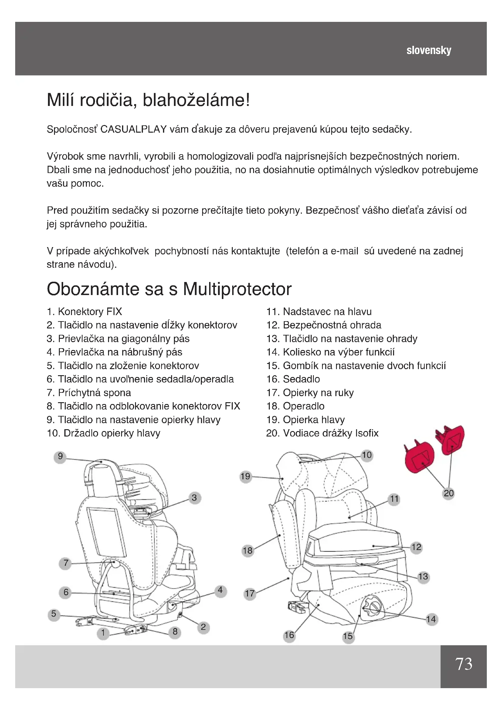 Milí rodičia, blahoželáme! Spoločnosť CASUALPLAY vám ďakuje za dôveru prejavenú kúpou tejto sedačky. Výrobok sme navrhli, vyrobili a homologizovali podľa najprísnejších bezpečnostných noriem. Dbali sme na jednoduchosť jeho použitia, no na dosiahnutie optimálnych výsledkov potrebujeme vašu pomoc. Pred použitím sedačky si pozorne prečítajte tieto pokyny. Bezpečnosť vášho dieťaťa závisí od jej správneho použitia. V prípade akýchkoľvek pochybností nás kontaktujte (telefón a e-mail sú uvedené na zadnej strane návodu). Oboznámte sa s Multiprotector slovensky74