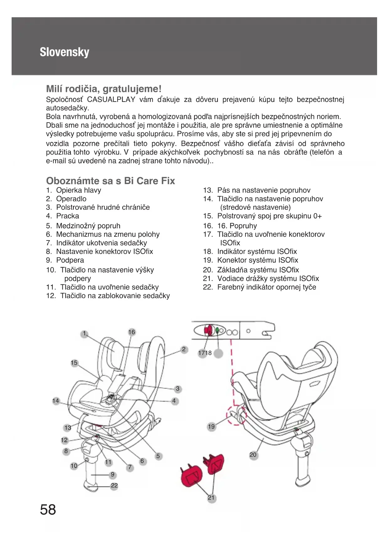 Milí rodičia, gratulujeme! Spoločnosť CASUALPLAY vám ďakuje za dôveru prejavenú kúpu tejto bezpečnostnej autosedačky. Bola navrhnutá, vyrobená a homologizovaná podľa najprísnejších bezpečnostných noriem. Dbali sme na jednoduchosť jej montáže i použitia, ale pre správne umiestnenie a optimálne výsledky potrebujeme vašu spoluprácu. Prosíme vás, aby ste si pred jej pripevnením do vozidla pozorne prečítali tieto pokyny. Bezpečnosť vášho dieťaťa závisí od správneho použitia tohto výrobku. V prípade akýchkoľvek pochybností sa na nás obráťte (telefón a e-mail sú uvedené na zadnej strane tohto návodu)..59 Upozornenia a bezpečnostné poznámky NÁVOD TREBA ODLOŽIŤ DO SEDAČKY Bi Care Fix POČAS CELEJ DOBY JEJ POUŽÍVANIA. PRED POUŽITÍM VÝROBKU SI POZORNE PREČÍTAJTE TIETO POKYNY A ODLOŽTE SI ICH PRE PRÍPAD POTREBY V BUDÚCNOSTI. AK SA NIMI NEBUDETE RIADIŤ, MÔŽETE OHROZIŤ BEZPEČNOSŤ DIEŤAŤA.