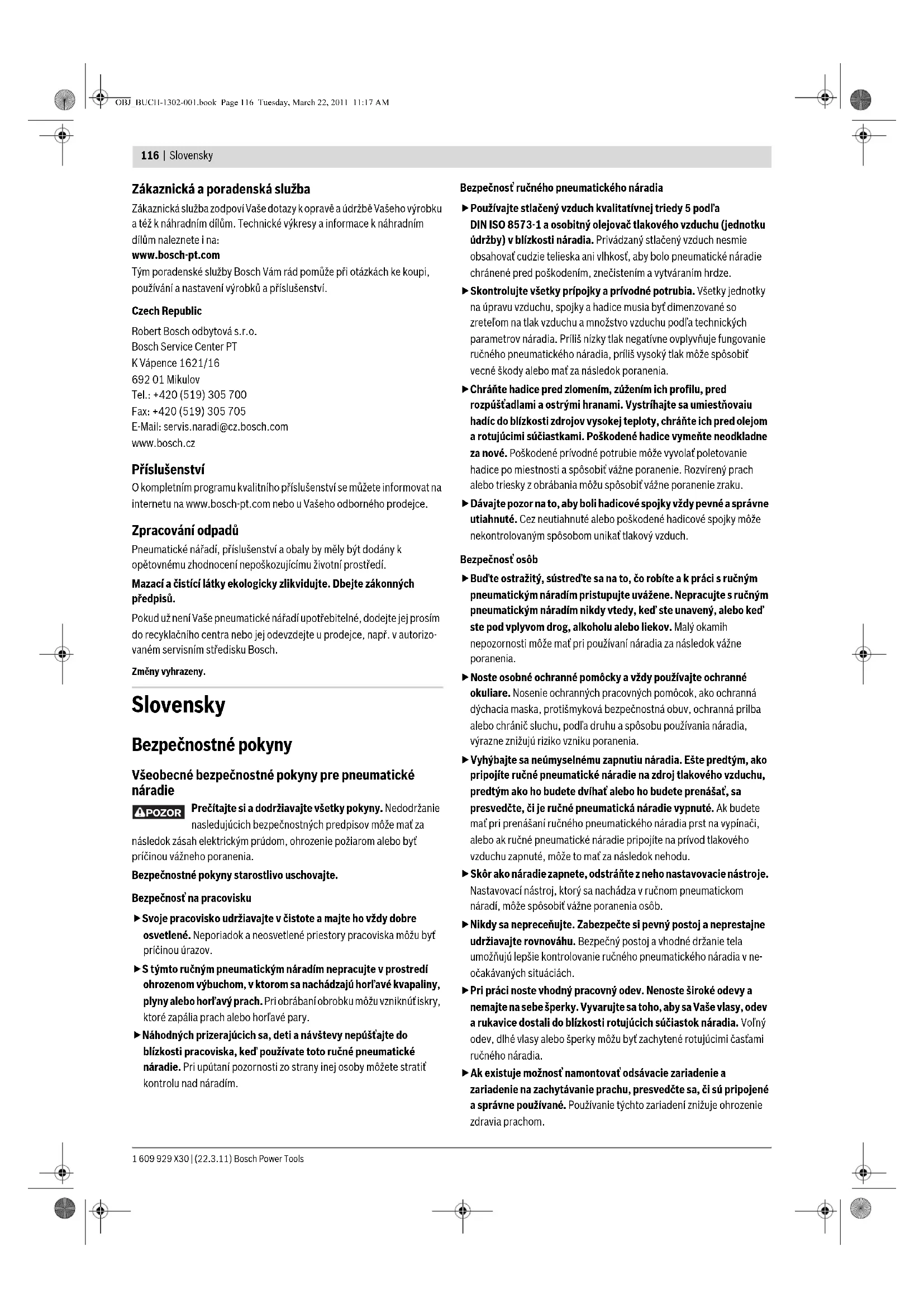 Hmotnosť podľa EPTA-Procedure 01/2003 kg 1,86 Dr. Egbert Schneider Senior Vice President Engineering Dr. Eckerhard Strötgen Head of Product Certification OBJ_BUCH-1302-001.book Page 118 Tuesday, March 22, 2011 11:17 AMSlovensky | 119 Bosch Power Tools 1 609 929 X30 | (22.3.11) Montáž Pripojenie na rozvod tlakového vzduchu (pozri obrázok A) Presvedčte sa o tom, či nie je tlak pneumatického rozvodu vzduchu väčší ako maximálny dovolený menovitý tlak vzduchu pneumatického náradia. Najprv nastavte tlak vzduchu na spodnú hodnotu odporúčaného menovitého tlaku vzduchu (pozri odsek „Technické údaje“). V prípade pochybností prekontrolujte tlak na vstupe pomocou neejakého manometra pri súčasne zapnutom ručnom pneumatickom náradí. Aby ste dosiahli maximálny výkon, musia byť dodržané hodnoty pre prívodnú tlakovú hadicu 15 (závit prípojky, maximálny prevádzkový tlak, svetlosť hadice, maximálna dĺžka hadice; pozri odsek „Technické údaje“). Privádzaný stlačený vzduch nesmie obsahovať cudzie telieska ani vlhkosť, aby bolo pneumatické náradie chránené pred poškodením, znečistením a vytváraním hrdze. Všetky armatúry, spojovacie potrubia a hadice musia byť dimenzované na príslušný tlak a požadované množstvo vzduchu. Vyhýbajte sa zúženiu prívodných potrubí, napríklad stlačením, zlomením alebo ťahaním! Pripojenie tlakového vzduchu na ručné pneumatické náradie – Vyprázdnite zásobník 10. (pozri odsek „Vyprázdnenie zásobníka“, strana 120) Pri nasledujúcich pracovných krokoch by mohol byť zatĺkací predmet vymrštený, ak sa počas opravy a údržby alebo prepravy nenachádzajú vnútorné súčiastky pneumatického náradia vo východiskovej polohe. – Spojte vzduchovú prípojku 8 s prívodnou hadicou tlakového vzduchu 15, ktorá je vybavená rýchloupínacou spojkou 14. – Skontrolujte bezchybnosť fungovania takým spôsobom, že pneumatické náradie ústím 13 prípadne pogumovaným chráničom obrobkov 1 priložíte na nejaký odpadový kúsok dreva alebo na nejaký drevený materiál a jeden až dvakrát náradie spustíte. Plnenie zásobníka (pozri obrázky B1–B4) Prerušte prívod tlakového vzduchu ešte predtým, ako budete vykonávať na ručnom pneumatickom náradí nastavovanie, výmenu príslušenstva, alebo predtým, ako ručné pneumatické náradie odložíte. Toto preven- tívne opatrenie zabraňuje neúmyselnému spusteniu ručného pneumatického náradia. fPoužívajte len originálne príslušenstvo Bosch (pozri odsek „Technické údaje“). Precízne súčiastky pneumatického náradia, ako sú zásobník, ústie a vystreľovací kanálik sú konštruované na prácu so svorkami, klincami a kolíkmi firmy Bosch. Iní výrobcovia používajú iné kvality ocele a iné rozmery. Používanie nedovolených zatĺkacích predmetov môže poškodiť pneumatické náradie a spôsobiť poranenia. Počas plnenia zásobníka držte pneumatické náradie v takej polohe, aby ústie 13 nebolo nasmerované ani na Vaše vlastné telo ani na žiadne iné osoby. – V prípade potreby posúvač zásobníka 11 vyčistite, premastite a starajte sa o to, aby nebol zásobník 10 znečistený. – Zasuňte vhodný pásik klincov 16 do štrbiny tvaru T na konci zásobníka