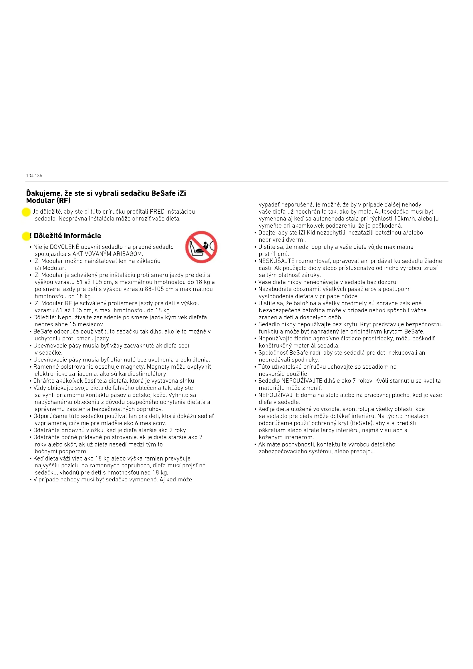 - V prípade nehody musí byť sedačka vymenená. Aj keď môže Ďakujeme, že ste si vybrali sedačku BeSafe iZi Modular (RF) ! Je dôležité, aby ste si túto príručku prečítali PRED inštaláciou sedadla. Nesprávna inštalácia môže ohroziť vaše dieťa. vypadať neporušená, je možné, že by v prípade ďalšej nehody vaše dieťa už neochránila tak, ako by mala. Autosedačka musí byť vymenená aj keď sa autonehoda stala pri rýchlosti 10km/h, alebo ju vymeňte pri akomkolvek podozreniu, že je poškodená.