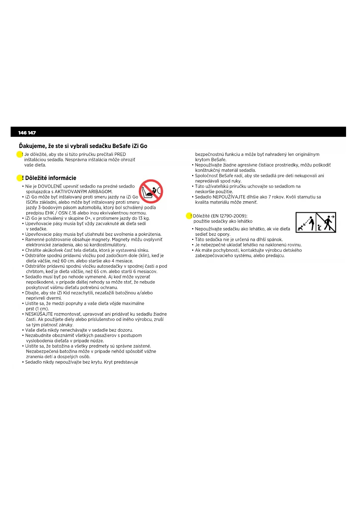 - Sedadlo nikdy nepoužívajte bez krytu. Kryt predstavuje Ďakujeme, že ste si vybrali sedačku BeSafe iZi Go ! Je dôležité, aby ste si túto príručku prečítali PRED inštaláciou sedadla. Nesprávna inštalácia môže ohroziť vaše dieťa. ! Dôležité (EN 12790-2009): použitie sedačky ako lehátko bezpečnostnú funkciu a môže byť nahradený len originálnym krytom BeSafe.
