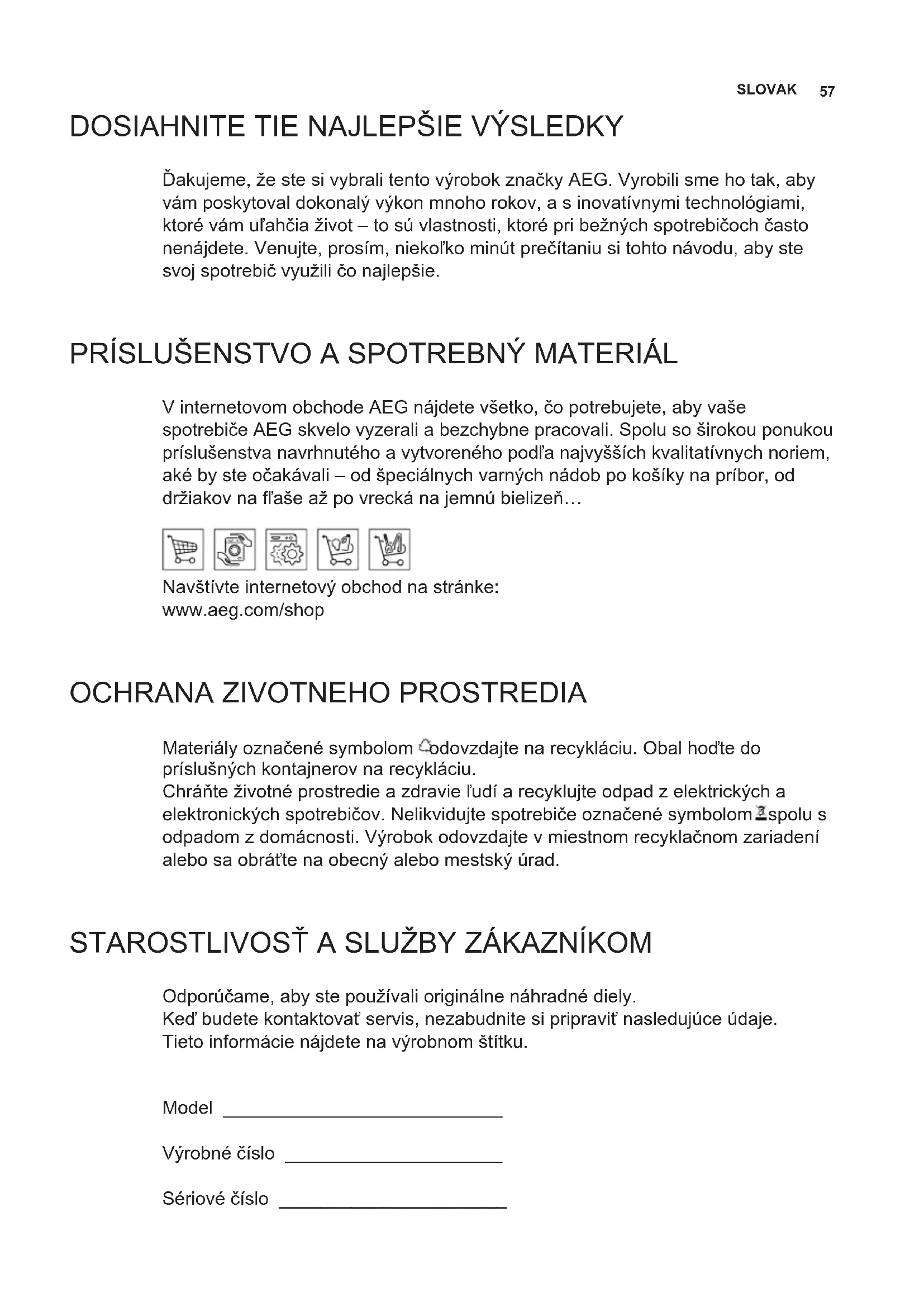 Ďakujeme, že ste si vybrali tento výrobok značky AEG. Vyrobili sme ho tak, aby vám poskytoval dokonalý výkon mnoho rokov, a s inovatívnymi technológiami, ktoré vám uľahčia život – to sú vlastnosti, ktoré pri bežných spotrebičoch často nenájdete. Venujte, prosím, niekoľko minút prečítaniu si tohto návodu, aby ste svoj spotrebič využili čo najlepšie. PRÍSLUŠENSTVO A SPOTREBNÝ MATERIÁL V internetovom obchode AEG nájdete všetko, čo potrebujete, aby vaše spotrebiče AEG skvelo vyzerali a bezchybne pracovali. Spolu so širokou ponukou príslušenstva navrhnutého a vytvoreného podľa najvyšších kvalitatívnych noriem, aké by ste očakávali – od špeciálnych varných nádob po košíky na príbor, od držiakov na fľaše až po vrecká na jemnú bielizeň… Navštívte internetový obchod na stránke: www.aeg.com/shop
