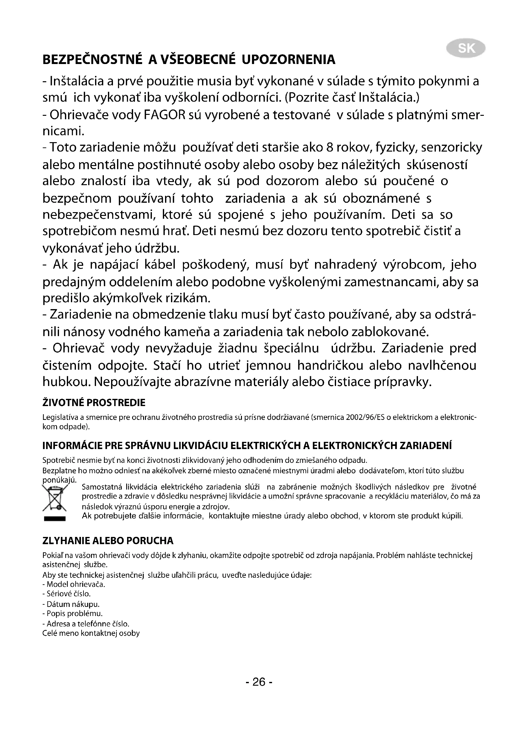 - Inštalácia a prvé použitie musia byť vykonané v súlade s týmito pokynmi a smú ich vykonať iba vyškolení odborníci. (Pozrite časť Inštalácia.) - Ohrievače vody FAGOR sú vyrobené a testované v súlade s platnými smer- nicami. - Toto zariadenie môžu používať deti staršie ako 8 rokov, fyzicky, senzoricky alebo mentálne postihnuté osoby alebo osoby bez náležitých skúseností alebo znalostí iba vtedy, ak sú pod dozorom alebo sú poučené o bezpečnom používaní tohto zariadenia a ak sú oboznámené s nebezpečenstvami, ktoré sú spojené s jeho používaním. Deti sa so spotrebičom nesmú hrať. Deti nesmú bez dozoru tento spotrebič čistiť a vykonávať jeho údržbu. - Ak je napájací kábel poškodený, musí byť nahradený výrobcom, jeho predajným oddelením alebo podobne vyškolenými zamestnancami, aby sa predišlo akýmkoľvek rizikám. - Zariadenie na obmedzenie tlaku musí byť často používané, aby sa odstrá- nili nánosy vodného kameňa a zariadenia tak nebolo zablokované. - Ohrievač vody nevyžaduje žiadnu špeciálnu údržbu. Zariadenie pred čistením odpojte. Stačí ho utrieť jemnou handričkou alebo navlhčenou hubkou. Nepoužívajte abrazívne materiály alebo čistiace prípravky. ŽIVOTNÉ PROSTREDIE Legislatíva a smernice pre ochranu životného prostredia sú prísne dodržiavané (smernica 2002/96/ES o elektrickom a elektronic- kom odpade). INFORMÁCIE PRE SPRÁVNU LIKVIDÁCIU ELEKTRICKÝCH A ELEKTRONICKÝCH ZARIADENÍ Spotrebič nesmie byť na konci životnosti zlikvidovaný jeho odhodením do zmiešaného odpadu. Bezplatne ho možno odniesť na akékoľvek zberné miesto označené miestnymi úradmi alebo dodávateľom, ktorí túto službu ponúkajú.