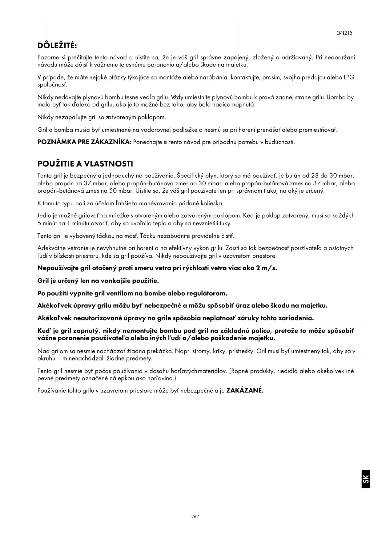 Tento gril je vybavený táckou na masť. Tácku nezabudnite pravidelne čistiť. Adekvátne vetranie je nevyhnutné pri horení a na efektívny výkon grilu. Zaistí sa tak bezpečnosť používateľa a ostatných ľudí v blízk osti priestoru, kde sa gril používa. Nikdy nepoužívajte gril v uzavretom priestore. Nepoužív ajte gril otočený proti smeru vetra pri rýchlosti vetra viac ako 2 m/s. Gril je určený len na vonkajšie použitie. Po použití vypnite gril ventilom na bombe alebo regulátorom. Akékoľvek úpravy grilu môžu byť nebezpečné a môžu spôsobiť úraz alebo škodu na majetku. Akékoľvek neautorizované úpravy na grile spôsobia neplatnosť záruky tohto zariadenia. Keď je gril zapnutý, nikdy nemontujte bombu pod gril na základnú policu, pretože to môže spôsobiť vážne poranenie používateľa alebo iných ľudí a/alebo poškodenie majetku. Nad grilom sa nesmie nachádzať žiadna prekážka. Napr. stromy, kríky, prístrešky. Gril musí byť umiestnený tak, aby sa v okruhu 1 m nenachádzali žiadne predmety. Tento gril nesmie byť počas používania v dosahu horľavých materiálov . (Ropné produkty, riedidlá alebo akékoľvek iné pevné predmety označené nálepkou ako horľavina.) Používanie tohto grilu v uzavretom priestore môže byť nebezpečné a je ZAKÁZANÉ. SK268