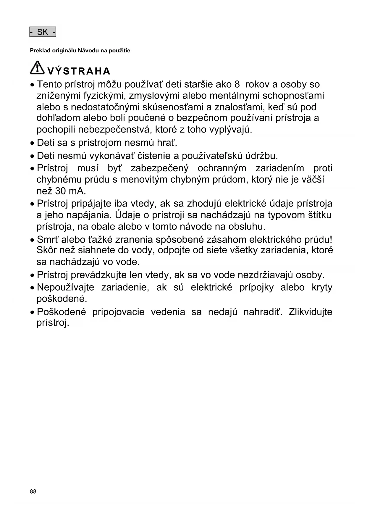 - Smrť alebo ťažké zranenia spôsobené zásahom elektrického prúdu! Skôr než siahnete do vody, odpojte od siete všetky zariadenia, ktoré sa nachádzajú vo vode.