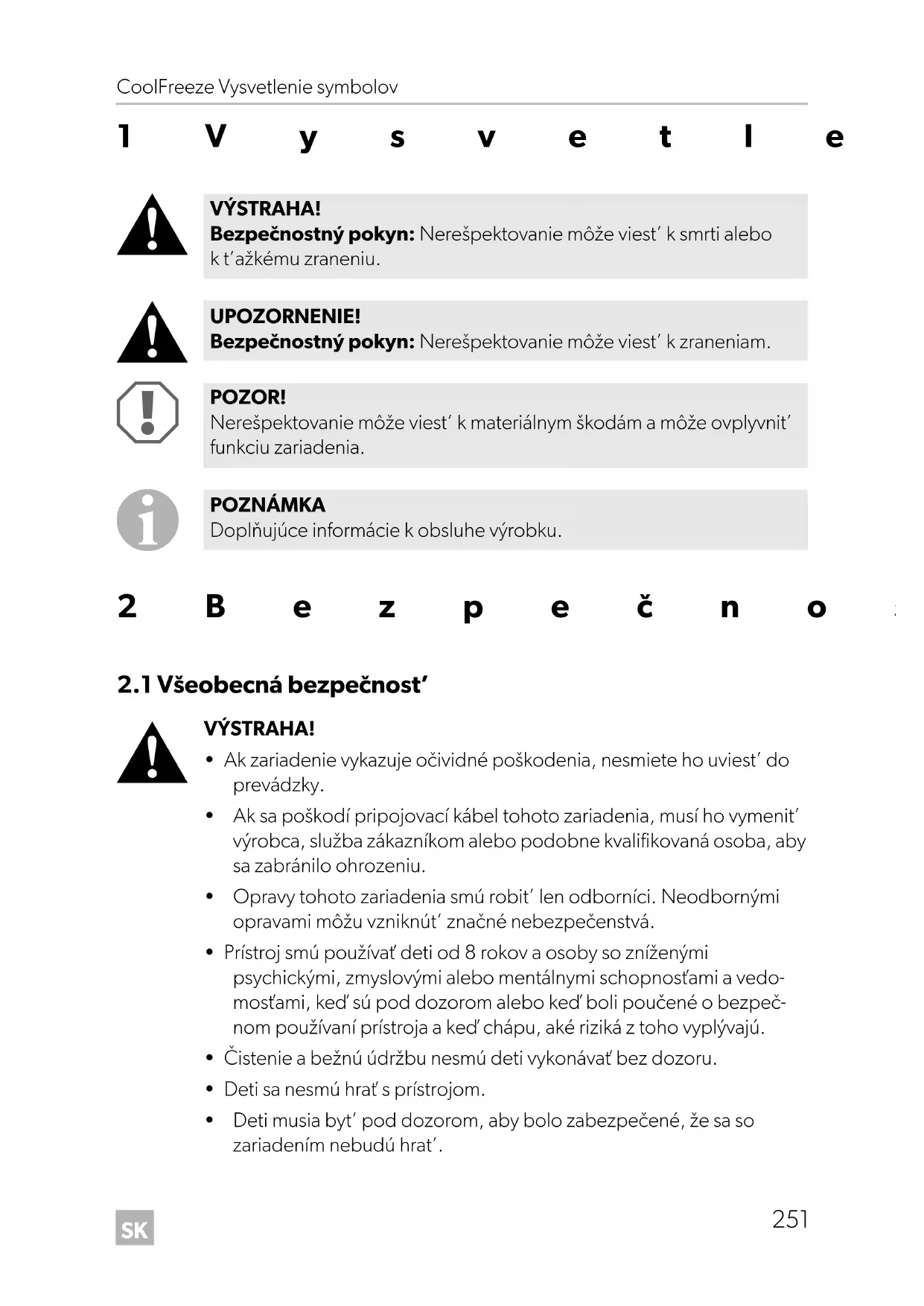- Deti musia byt’ pod dozorom, aby bolo zabezpečené, že sa so zariadením nebudú hrat’. VÝSTRAHA! Bezpečnostný pokyn: Nerešpektovanie môže viest’ k smrti alebo k t’ažkému zraneniu. UPOZORNENIE! Bezpečnostný pokyn: Nerešpektovanie môže viest’ k zraneniam. POZOR! Nerešpektovanie môže viest’ k materiálnym škodám a môže ovplyvnit’ funkciu zariadenia. POZNÁMKA Doplňujúce informácie k obsluhe výrobku. CDF18-26-36-46--O-16s.book Seite 251 Montag, 7. November 2016 2:13 14SK Bezpečnostné pokyny CoolFreeze