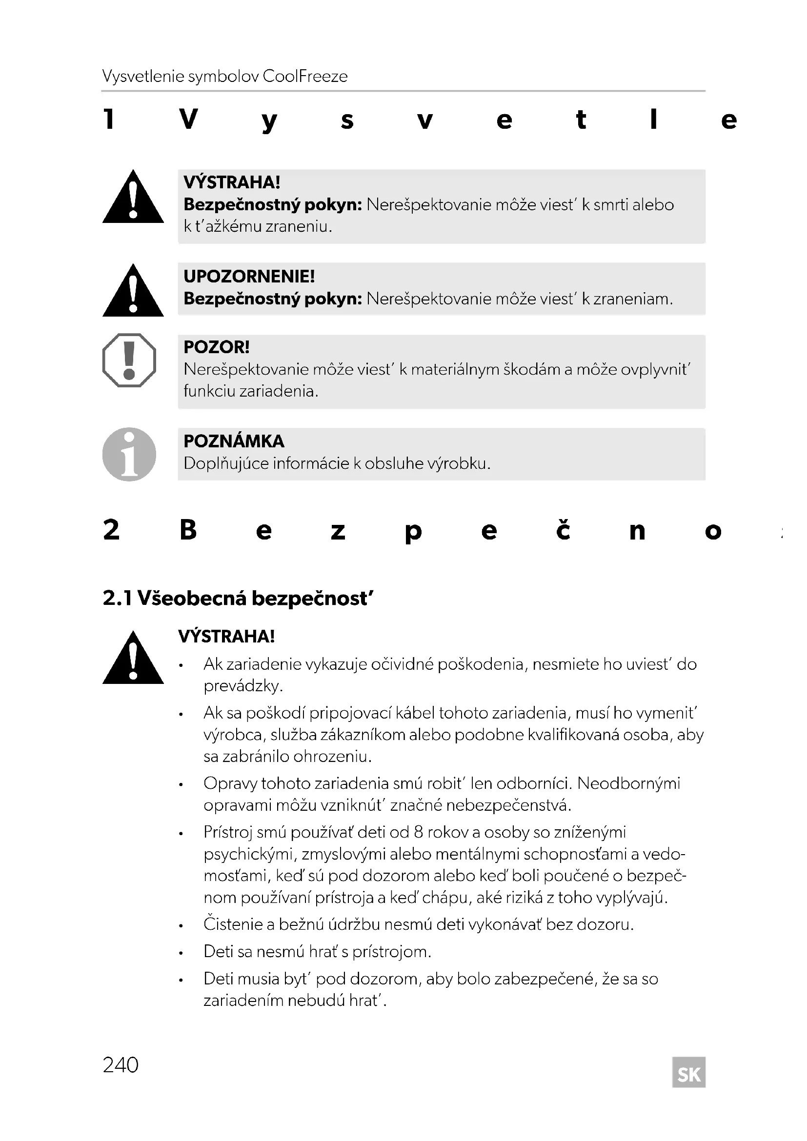 Deti musia byt’ pod dozorom, aby bolo zabezpečené, že sa so zariadením nebudú hrat’. VÝSTRAHA! Bezpečnostný pokyn: Nerešpektovanie môže viest’ k smrti alebo k t’ažkému zraneniu. UPOZORNENIE! Bezpečnostný pokyn: Nerešpektovanie môže viest’ k zraneniam. POZOR! Nerešpektovanie môže viest’ k materiálnym škodám a môže ovplyvnit’ funkciu zariadenia. POZNÁMKA Doplňujúce informácie k obsluhe výrobku. CDF18-26-36-46--O-16s.book Seite 240 Freitag, 29. Juni 2018 4:25 16SK CoolFreeze Bezpečnostné pokyny