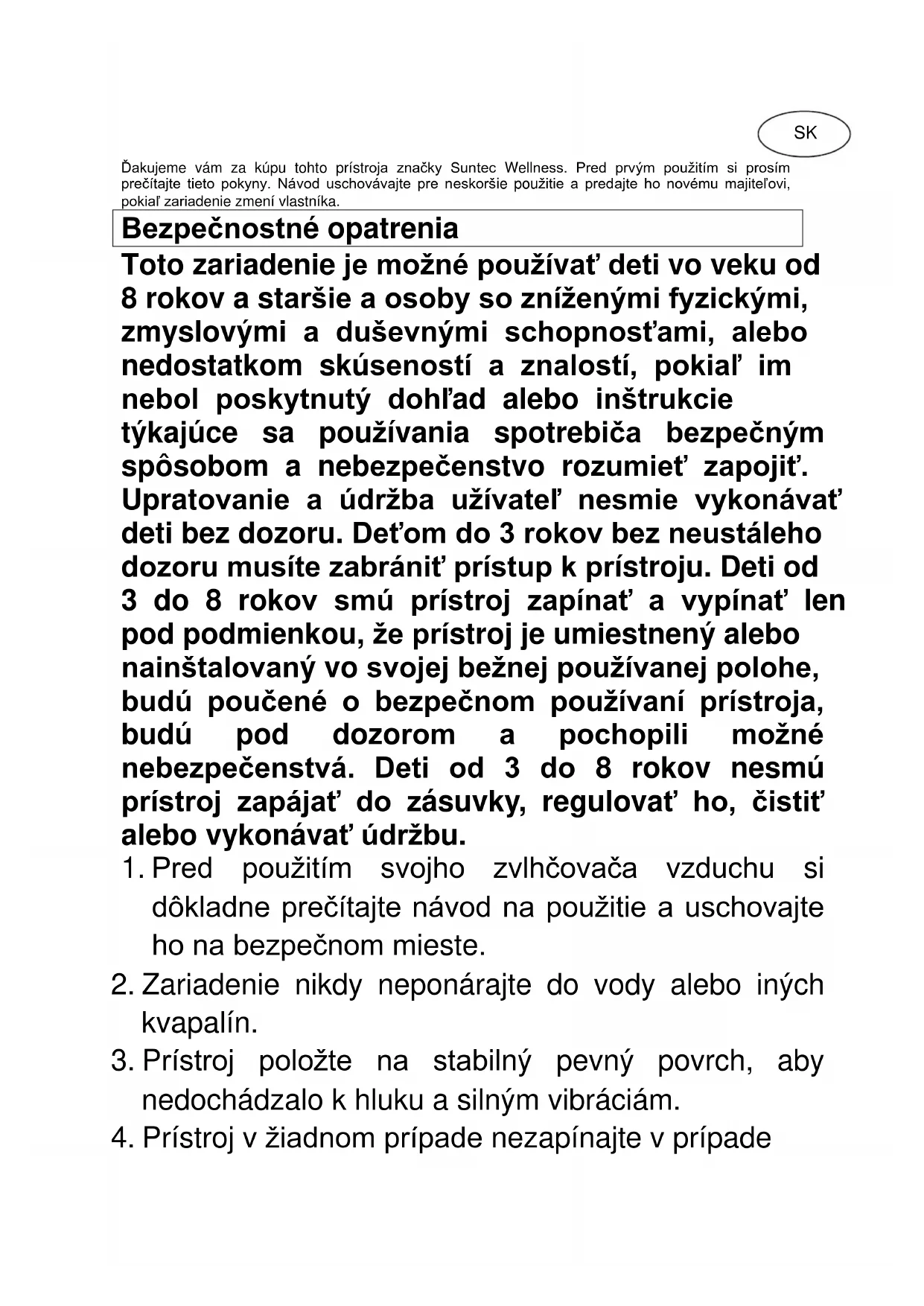 DryFix SUNTEC WELLNESS GMBH / HOLZSTRASSE 2 / 40 221 DÜSSELDORF / GERMANYĎakujeme vám za kúpu tohto prístroja značky Suntec Wellness. Pred prvým použitím si prosím prečítajte tieto pokyny. Návod uschovávajte pre neskoršie použitie a predajte ho novému majiteľovi, pokiaľ zariadenie zmení vlastníka. Bezpečnostné opatrenia Toto zariadenie je možné používať deti vo veku od 8 rokov a staršie a osoby so zníženými fyzickými, zmyslovými a duševnými schopnosťami, alebo nedostatkom skúseností a znalostí, pokiaľ im nebol poskytnutý dohľad alebo inštrukcie týkajúce sa používania spotrebiča bezpečným spôsobom a nebezpečenstvo rozumieť zapojiť. Upratovanie a údržba užívateľ nesmie vykonávať deti bez dozoru. Deťom do 3 rokov bez neustáleho dozoru musíte zabrániť prístup k prístroju. Deti od 3 do 8 rokov smú prístroj zapínať a vypínať len pod podmienkou, že prístroj je umiestnený alebo nainštalovaný vo svojej bežnej používanej polohe, budú poučené o bezpečnom používaní prístroja, budú pod dozorom a pochopili možné nebezpečenstvá. Deti od 3 do 8 rokov nesmú prístroj zapájať do zásuvky, regulovať ho, čistiť alebo vykonávať údržbu.
