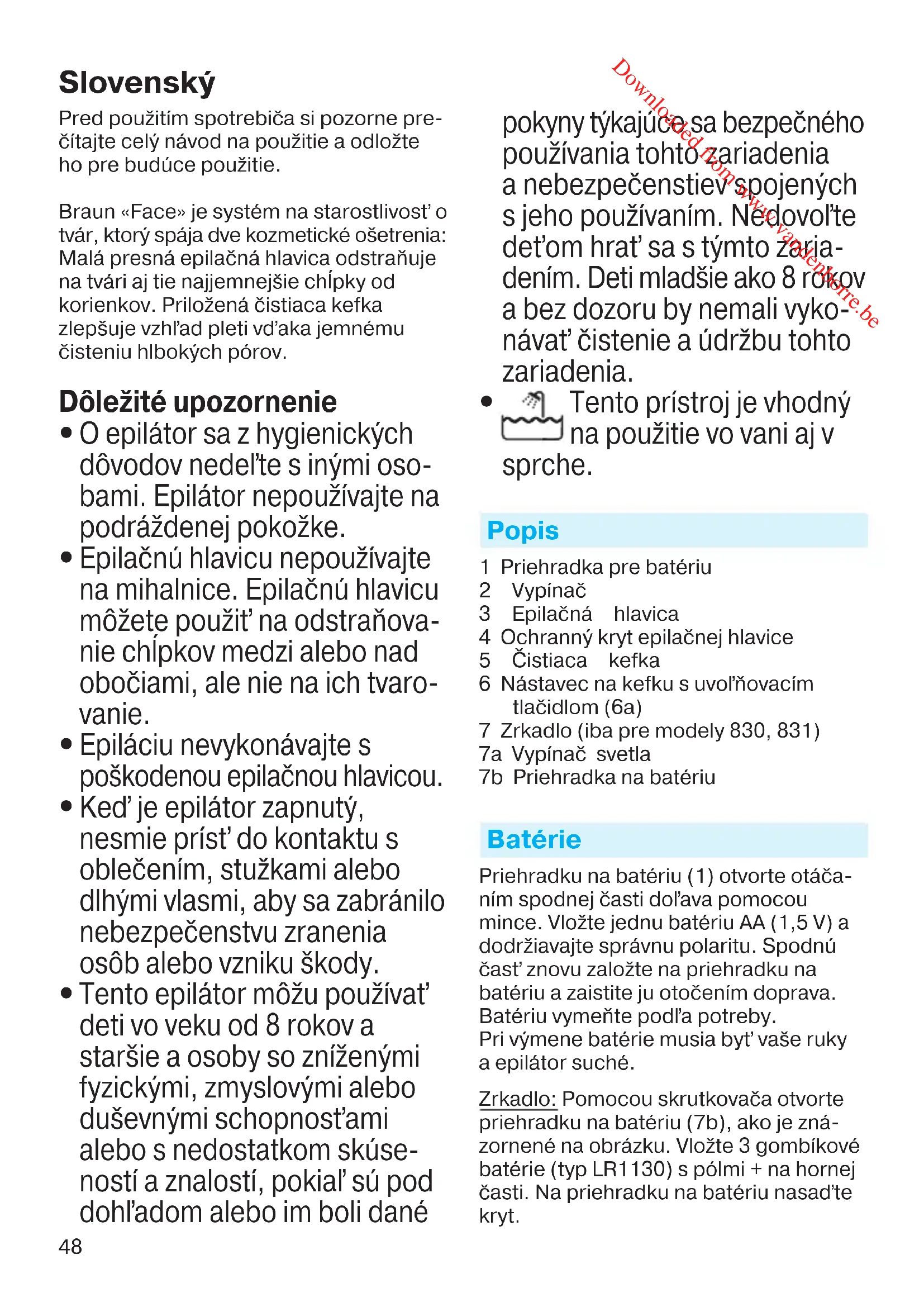 Tento prístroj je vhodný na použitie vo vani aj v sprche. Popis 1 Priehradka pre batériu 2 Vypínač 3 Epilačná hlavica 4 Ochranný kryt epilačnej hlavice 5 Čistiaca kefka 6 Nástavec na kefku s uvoľňovacím tlačidlom (6a) 7 Zrkadlo (iba pre modely 830, 831) 7a Vypínač svetla 7b Priehradka na batériu Batérie Priehradku na batériu (1) otvorte otáča- ním spodnej časti doľava pomocou mince. Vložte jednu batériu AA (1,5 V) a dodržiavajte správnu polaritu. Spodnú časť znovu založte na priehradku na batériu a zaistite ju otočením doprava. Batériu vymeňte podľa potreby. Pri výmene batérie musia byť vaše ruky a epilátor suché. Zrkadlo: Pomocou skrutkovača otvorte priehradku na batériu (7b), ako je zná- zornené na obrázku. Vložte 3 gombíkové batérie (typ LR1130) s pólmi + na hornej časti. Na priehradku na batériu nasaďte kryt. 96892473_SE810_S4-110.indd 4896892473_SE810_S4-110.indd 48 27.02.14 15:3327.02.14 15:33 CSS APPROVED Effective Date 5Mar2014 GMT - Printed 02Oct2014 Page 48 of 110 Downloaded from www.vandenborre.be49 Ak sú batérie vybité alebo sa dlhšiu dobu nepoužívajú, môžu vytiecť. Batérie včas vymeňte a pri manipulácii s presa- kujúcimi batériami zabráňte kontaktu s pokožkou, aby ste boli chránení spolu so zariadením. Epilácia tváre