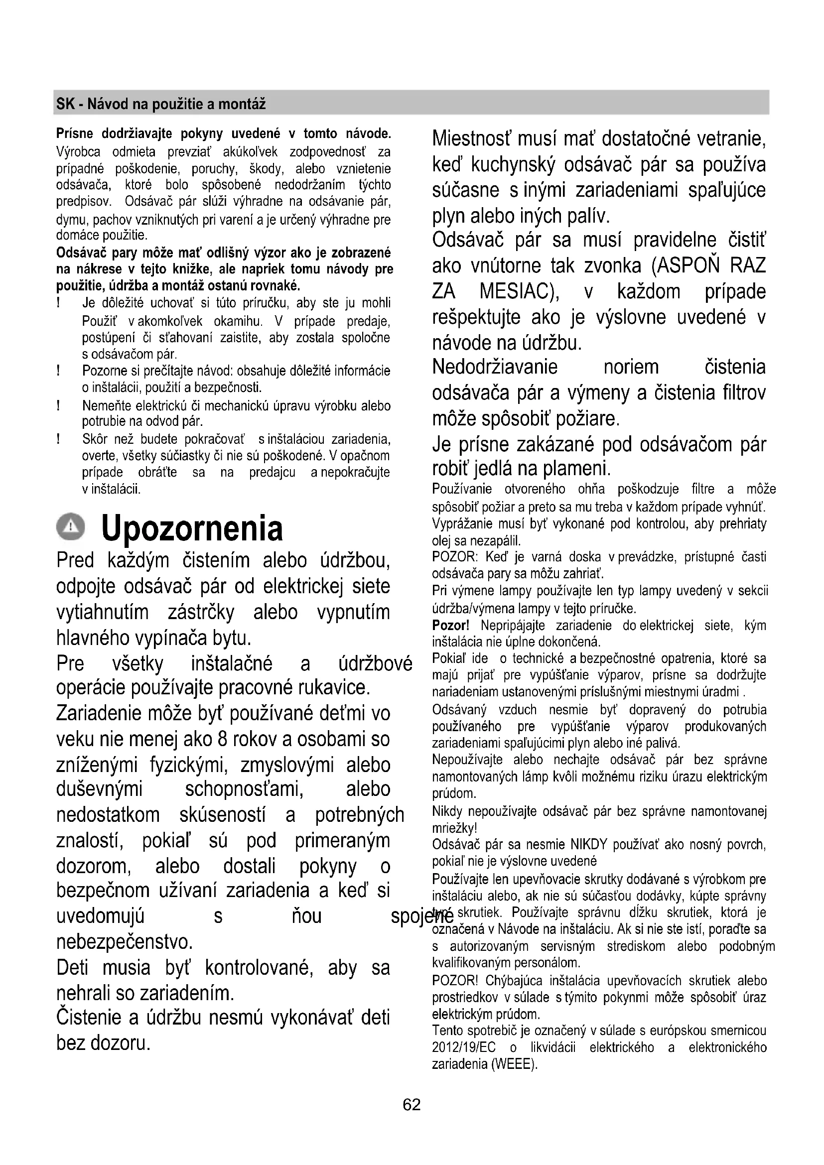 - Uhlíkový filtr není opotřebený. Údržba Čištění Pro čištění je třeba použít VÝHRADNĚ látku navlhčenou neutrálními tekutými čistícími prostředky. NEPOUŽÍVEJTE ŽÁDNÉ NÁSTROJE NEBO POMŮCKY NA ČIŠTĚNÍ. NEPOUŽÍVEJTE ALKOHOL! Tukový filtr Zadržuje částice tuku uvolňující se při vaření. Tukový filtr se musí 1 x do měsíce vyčistit . Je možné jej čistit ručně jemným mycím prostředkem nebo v kuchyňské myčce při nejnižší teplotě a kratším programu. Filtr s aktivním uhlíkem (jen u filtrační verze) Tento filtr pohlcuje nepříjemné pachy vznikající při vaření. Saturace filtru s uhlíkem nastane po více či méně dlouhém užití, tj. závisí na typu kuchyně a pravidelném čištění filtru proti mastnotám. V každém případě je nutné nahradit patronu maximálně jednou za 4 měsíce. NEMŮŽE být umýván či regenerován. Výměna žárovek Odpojte přístroj z elektrické sítě. Pozor! Dříve než se doktnete svítidel si ověřte že vychladla. Poškozenou žárovku vyměňte za novou stejného typu, dle údajů uvedených na technickém štítku nebo vedle žárovky přímo na digestoři. Při výměně žárovek čtvercových světel stiskněte rámeček světla v místě označeném nápisem “PUSH”, vyměňte žárovky a připevněte světla stisknutím jejich rámečku. Používejte pouze halogenová svítidla o výkonu 12V - 20W max - G4 a dávejte pozor, abyste se jich nedotýkali rukama. Jestliže osvětlení nefunguje, dříve než zavoláte servis si ověřte, zda jste správně nasadili žárovky do uložení.62 SK - Návod na použitie a montáž Prísne dodržiavajte pokyny uvedené v tomto návode. Výrobca odmieta prevziať akúkoľvek zodpovednosť za prípadné poškodenie, poruchy, škody, alebo vznietenie odsávača, ktoré bolo spôsobené nedodržaním týchto predpisov. Odsávač pár slúži výhradne na odsávanie pár, dymu, pachov vzniknutých pri varení a je určený výhradne pre domáce použitie. Odsávač pary môže mať odlišný výzor ako je zobrazené na nákrese v tejto knižke, ale napriek tomu návody pre použitie, údržba a montáž ostanú rovnaké. ! Je dôležité uchovať si túto príručku, aby ste ju mohli Použiť v akomkoľvek okamihu. V prípade predaje, postúpení či sťahovaní zaistite, aby zostala spoločne s odsávačom pár. ! Pozorne si prečítajte návod: obsahuje dôležité informácie o inštalácii, použití a bezpečnosti. ! Nemeňte elektrickú či mechanickú úpravu výrobku alebo potrubie na odvod pár. ! Skôr než budete pokračovať s inštaláciou zariadenia, overte, všetky súčiastky či nie sú poškodené. V opačnom prípade obráťte sa na predajcu a nepokračujte v inštalácii. Upozornenia Pred každým čistením alebo údržbou, odpojte odsávač pár od elektrickej siete vytiahnutím zástrčky alebo vypnutím hlavného vypínača bytu. Pre všetky inštalačné a údržbové operácie používajte pracovné rukavice. Zariadenie môže byť používané deťmi vo veku nie menej ako 8 rokov a osobami so zníženými fyzickými, zmyslovými alebo duševnými schopnosťami, alebo nedostatkom skúseností a potrebných znalostí, pokiaľ sú pod primeraným dozorom, alebo dostali pokyny o bezpečnom užívaní zariadenia a keď si uvedomujú s ňou spojené nebezpečenstvo. Deti musia byť kontrolované, aby sa nehrali so zariadením. Čistenie a údržbu nesmú vykonávať deti bez dozoru. Miestnosť musí mať dostatočné vetranie, keď kuchynský odsávač pár sa používa súčasne s inými zariadeniami spaľujúce plyn alebo iných palív. Odsávač pár sa musí pravidelne čistiť ako vnútorne tak zvonka (ASPOŇ RAZ ZA MESIAC), v každom prípade rešpektujte ako je výslovne uvedené v návode na údržbu. Nedodržiavanie noriem čistenia odsávača pár a výmeny a čistenia filtrov môže spôsobiť požiare. Je prísne zakázané pod odsávačom pár robiť jedlá na plameni. Používanie otvoreného ohňa poškodzuje filtre a môže spôsobiť požiar a preto sa mu treba v každom prípade vyhnúť. Vyprážanie musí byť vykonané pod kontrolou, aby prehriaty olej sa nezapálil. POZOR: Keď je varná doska v prevádzke, prístupné časti odsávača pary sa môžu zahriať. Pri výmene lampy používajte len typ lampy uvedený v sekcii údržba/výmena lampy v tejto príručke. Pozor! Nepripájajte zariadenie do elektrickej siete, kým inštalácia nie úplne dokončená. Pokiaľ ide o technické a bezpečnostné opatrenia, ktoré sa majú prijať pre vypúšťanie výparov, prísne sa dodržujte nariadeniam ustanovenými príslušnými miestnymi úradmi . Odsávaný vzduch nesmie byť dopravený do potrubia používaného pre vypúšťanie výparov produkovaných zariadeniami spaľujúcimi plyn alebo iné palivá. Nepoužívajte alebo nechajte odsávač pár bez správne namontovaných lámp kvôli možnému riziku úrazu elektrickým prúdom. Nikdy nepoužívajte odsávač pár bez správne namontovanej mriežky! Odsávač pár sa nesmie NIKDY používať ako nosný povrch, pokiaľ nie je výslovne uvedené Používajte len upevňovacie skrutky dodávané s výrobkom pre inštaláciu alebo, ak nie sú súčasťou dodávky, kúpte správny typ skrutiek. Používajte správnu dĺžku skrutiek, ktorá je označená v Návode na inštaláciu. Ak si nie ste istí, poraďte sa s autorizovaným servisným strediskom alebo podobným kvalifikovaným personálom. POZOR! Chýbajúca inštalácia upevňovacích skrutiek alebo prostriedkov v súlade s týmito pokynmi môže spôsobiť úraz elektrickým prúdom. Tento spotrebič je označený v súlade s európskou smernicou 2012/19/EC o likvidácii elektrického a elektronického zariadenia (WEEE).63 Uistením sa, že tento výrobok bol po svojej životnosti odstránený správnym spôsobom, užívateľ prispieva k predchádzaniu možným negatívnym násl