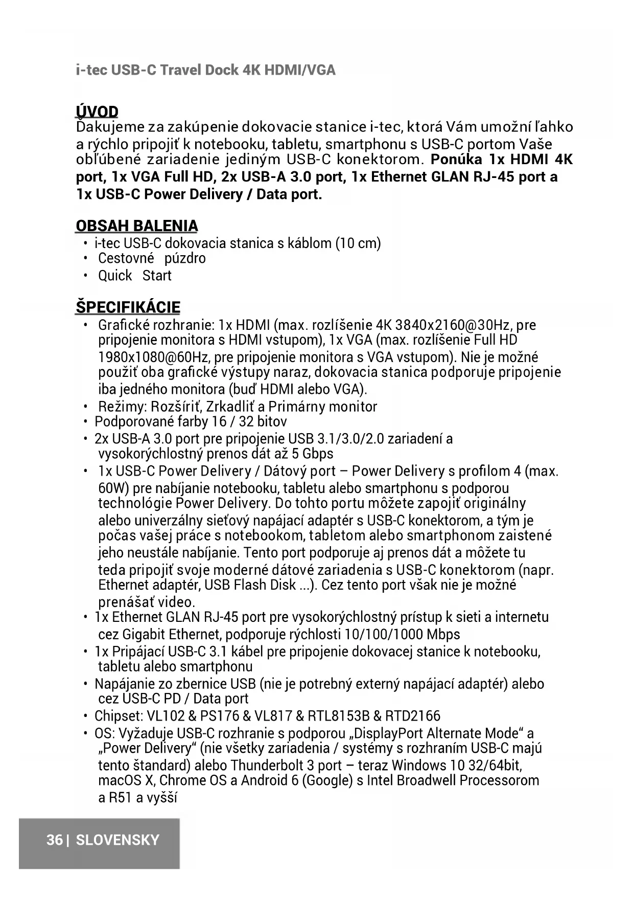 i-tec USB-C Travel Dock 4K HDMI/VGA ÚVOD Ďakujeme za zakúpenie dokovacie stanice i-tec, ktorá Vám umožní ľahko a rýchlo pripojiť k notebooku, tabletu, smartphonu s USB-C portom Vaše obľúbené zariadenie jediným USB-C konektorom. Ponúka 1x HDMI 4K port, 1x VGA Full HD, 2x USB-A 3.0 port, 1x Ethernet GLAN RJ-45 port a 1x USB-C Power Delivery / Data port. OBSAH BALENIA